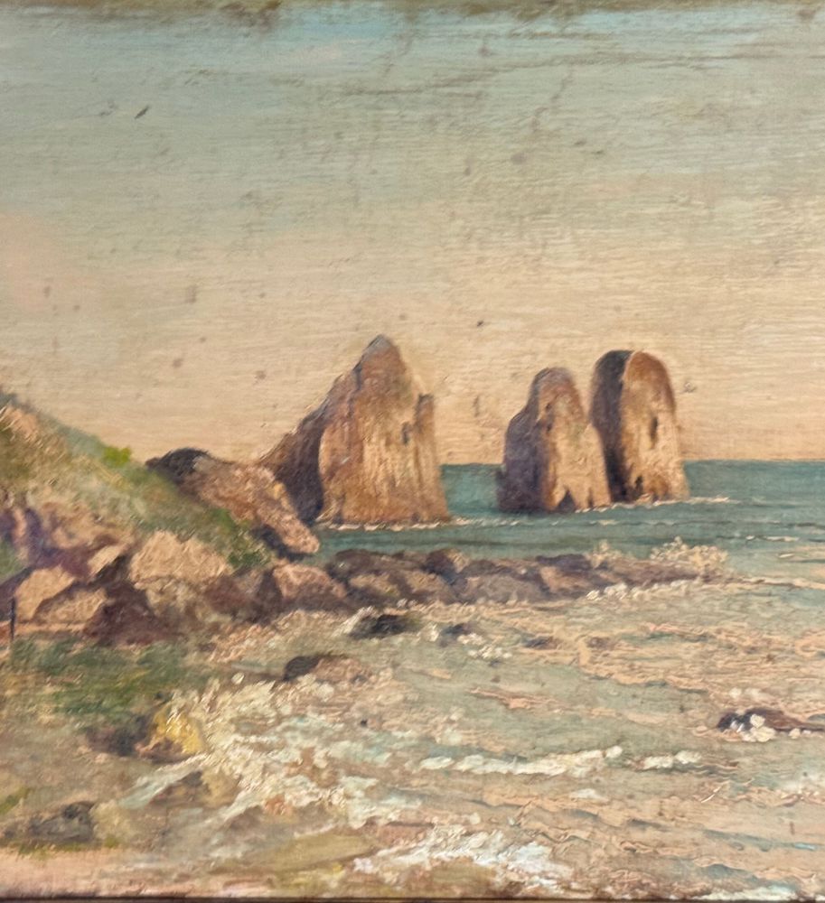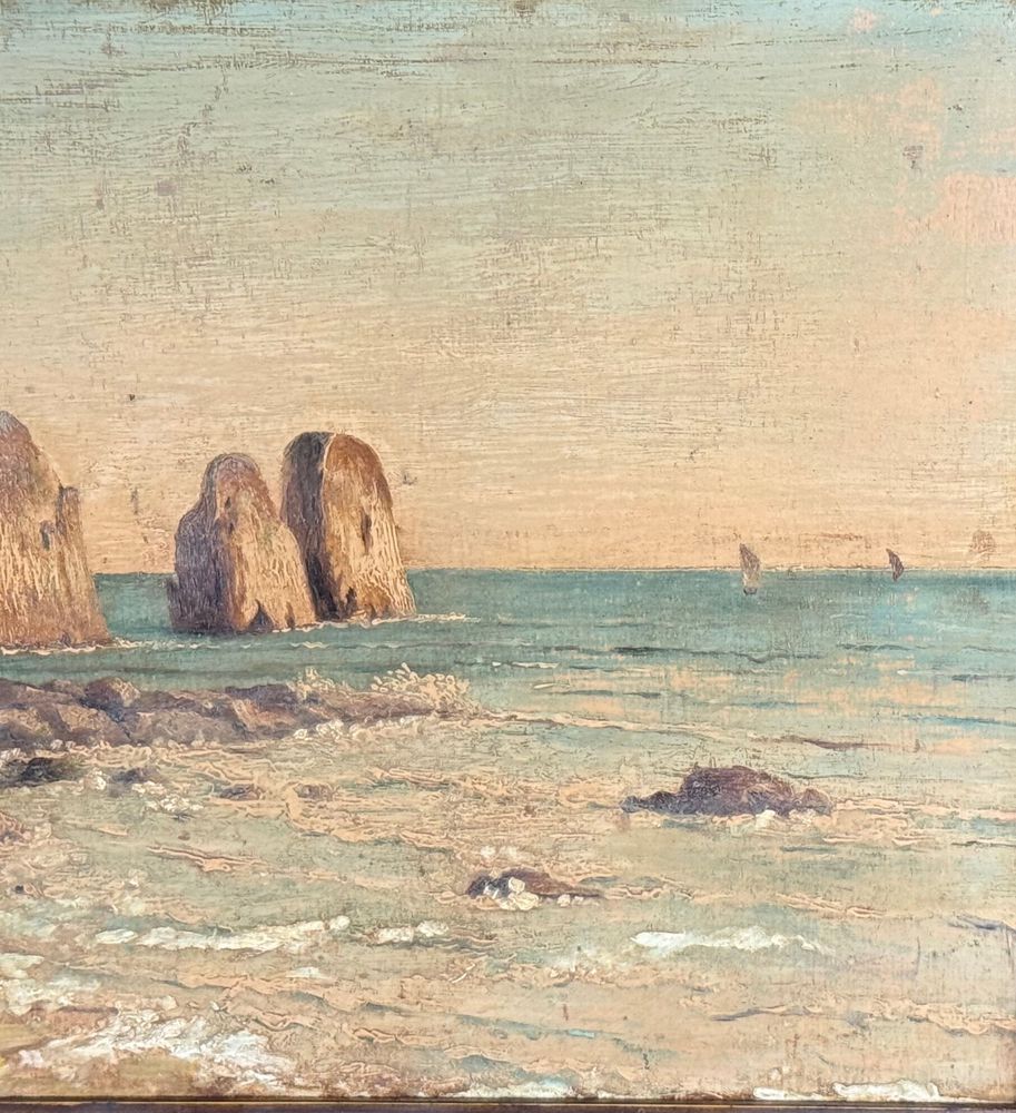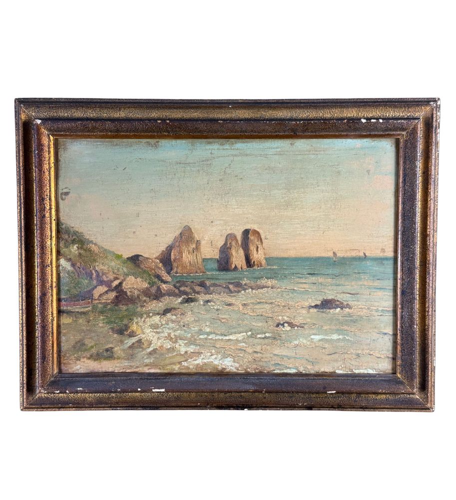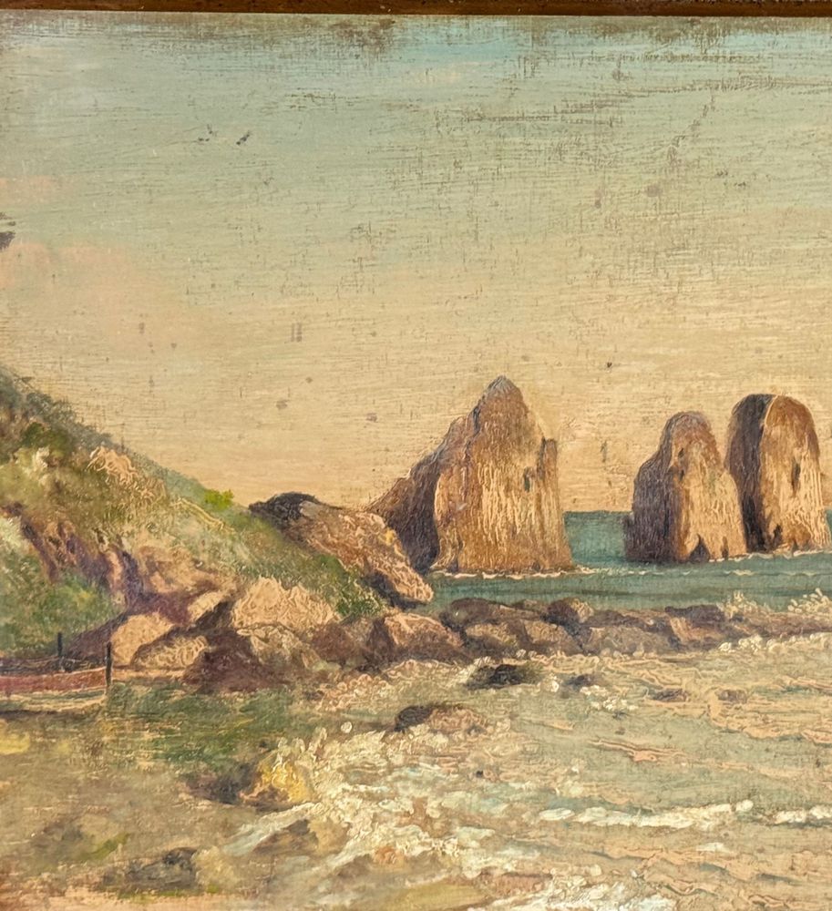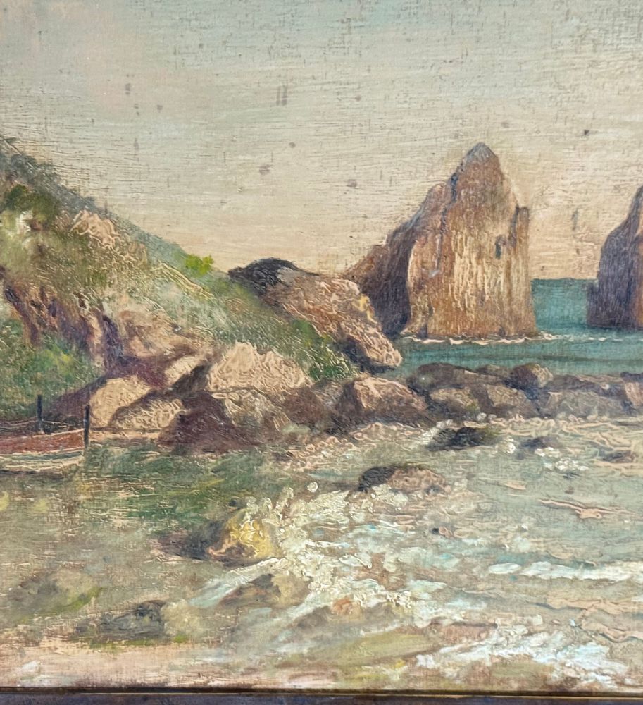 Dipinto olio su tavola, periodo XX secolo, scuola Italiana, raffigurante Scorcio di marina a Capri. Dimensioni compreso cornice: 60x45 cm. Dimensioni interno cornice: 50x35 cm. Da artista anonimo. Opera in buone condizioni con lievi segni di vissuto come da foto allegate.