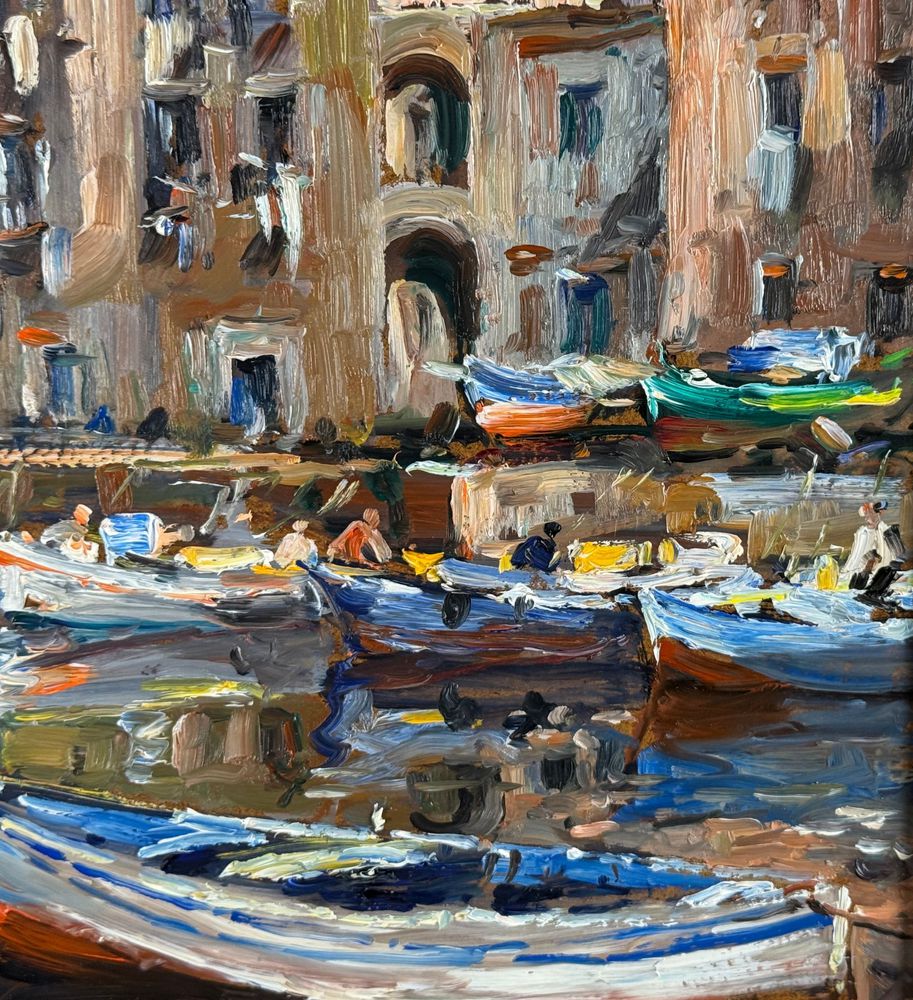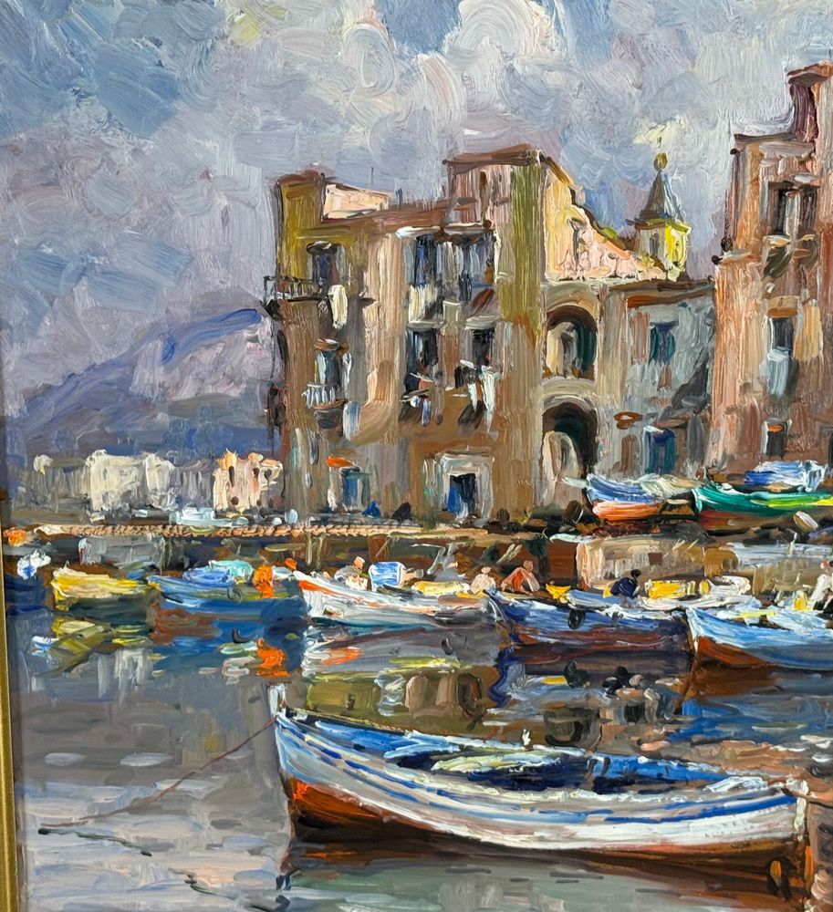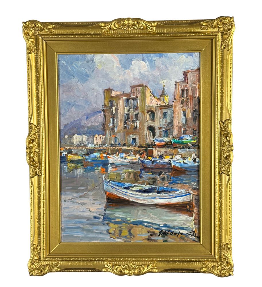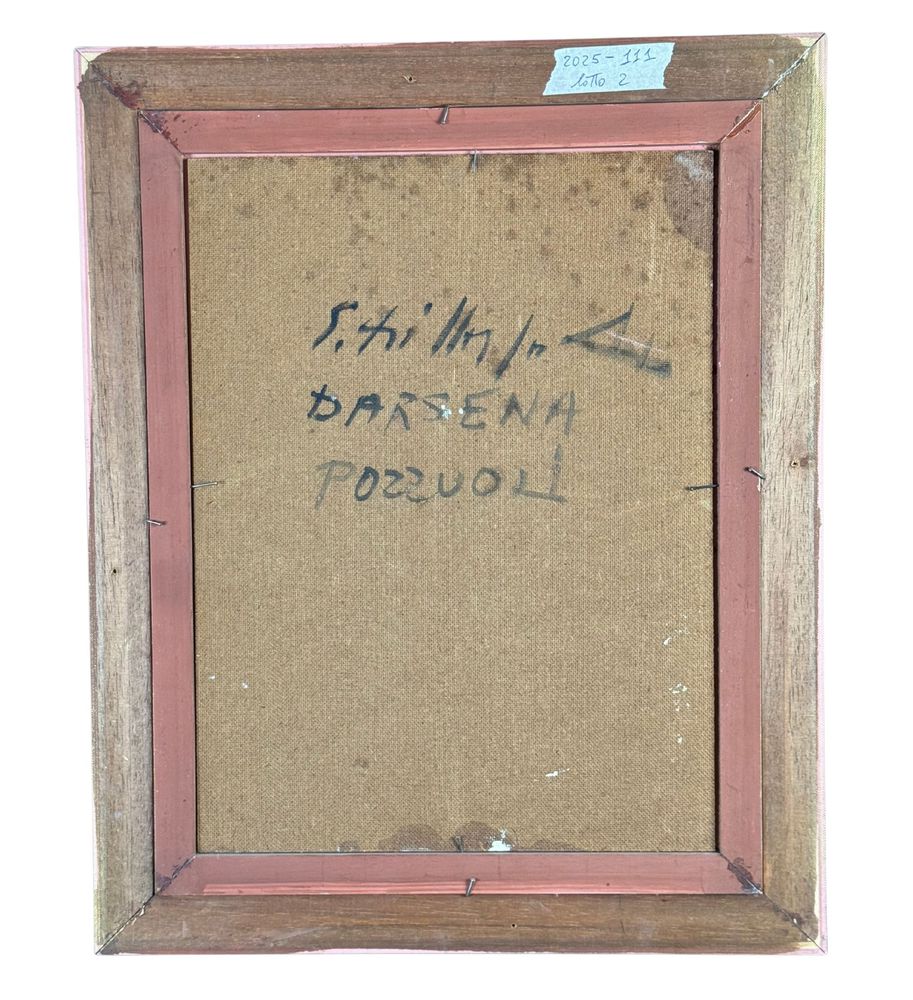 Dipinto olio su pannello, periodo XX secolo, scuola Italiana, raffigurante La darsena di Pozzuoli. Dimensioni compreso cornice: 42x52 cm. Dimensioni interno cornice: 30x40 cm. Firmato in basso a destra da artista non identificato. Opera in buone condizioni.