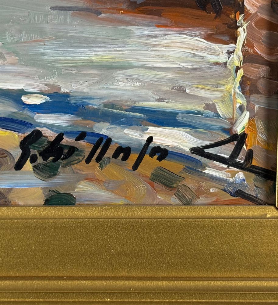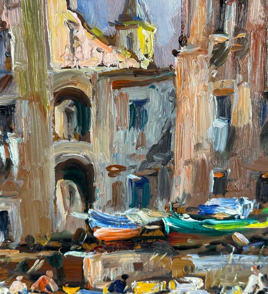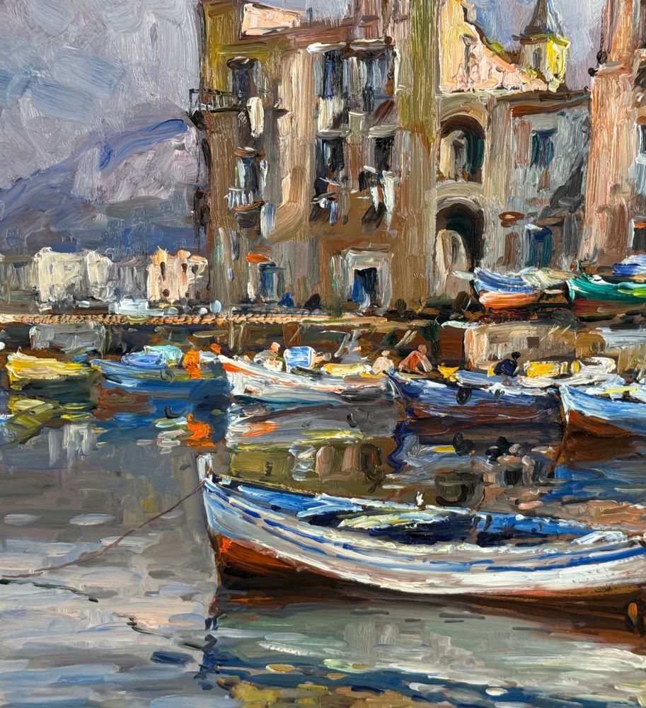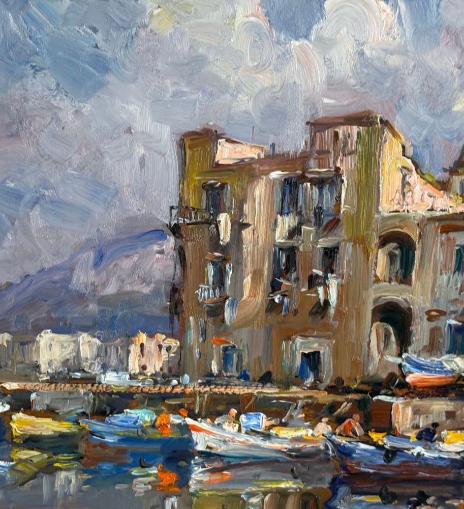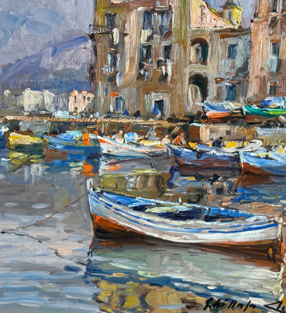 Dipinto olio su pannello, periodo XX secolo, scuola Italiana, raffigurante La darsena di Pozzuoli. Dimensioni compreso cornice: 42x52 cm. Dimensioni interno cornice: 30x40 cm. Firmato in basso a destra da artista non identificato. Opera in buone condizioni.