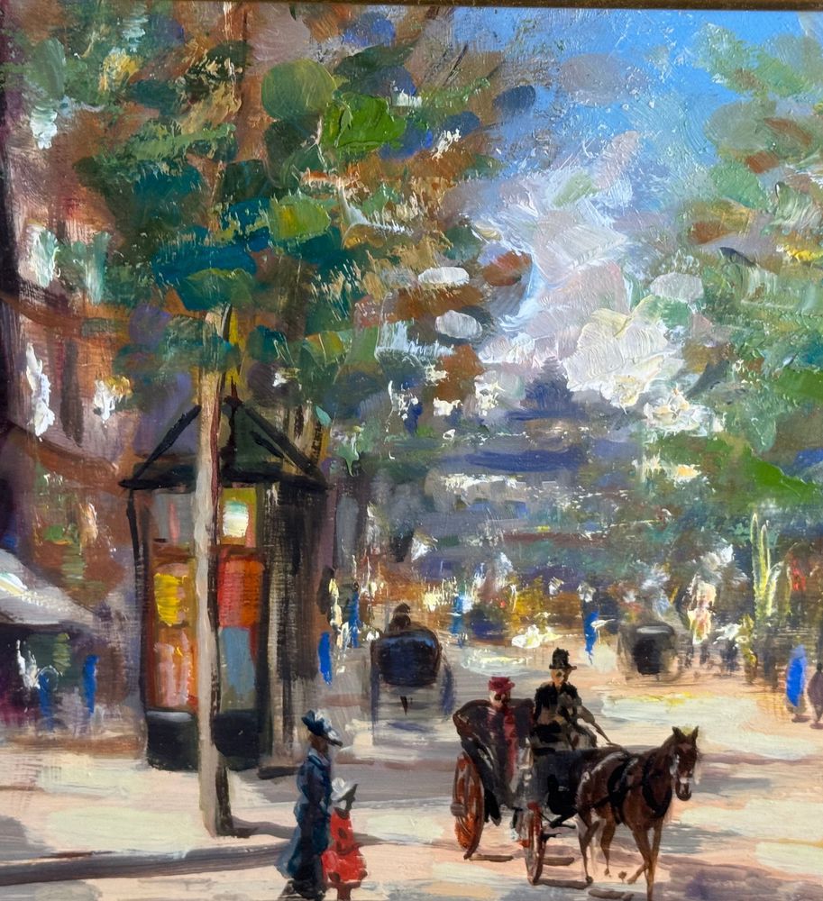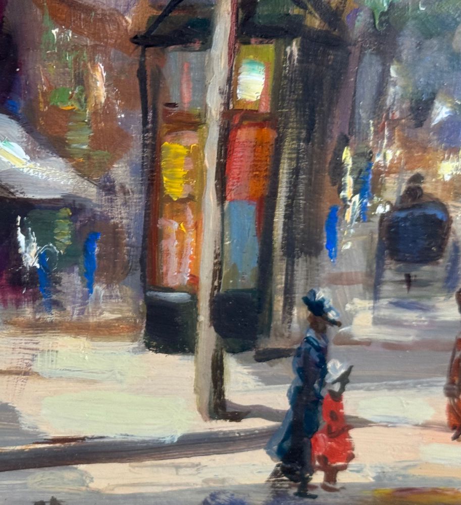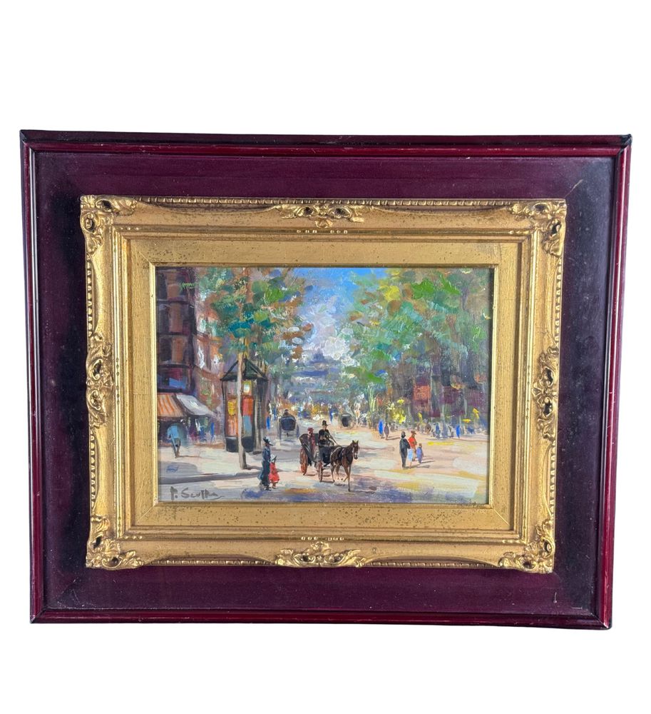 Dipinto olio su tavola, periodo XX secolo, scuola Italiana, raffigurante Strada con personaggi. Dimensioni compreso cornice: 60x50 cm. Dimensioni interno cornice: 25x35 cm. Firmato in basso a sinistra artista non identificato. Opera in ottime condizioni e di eccellente qualità artistica.