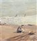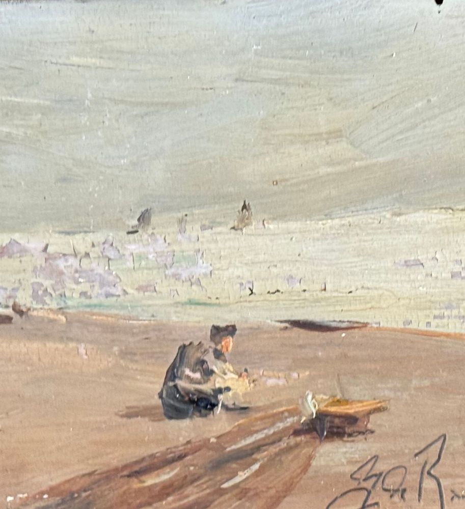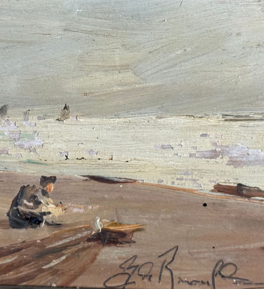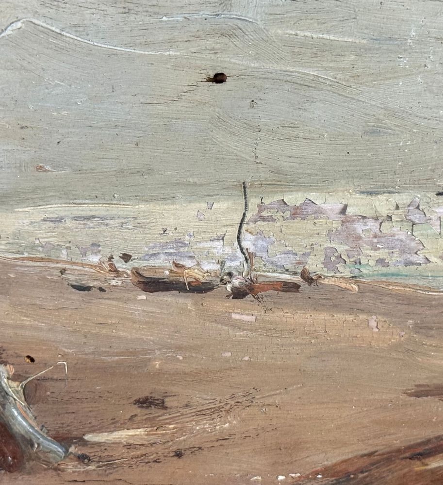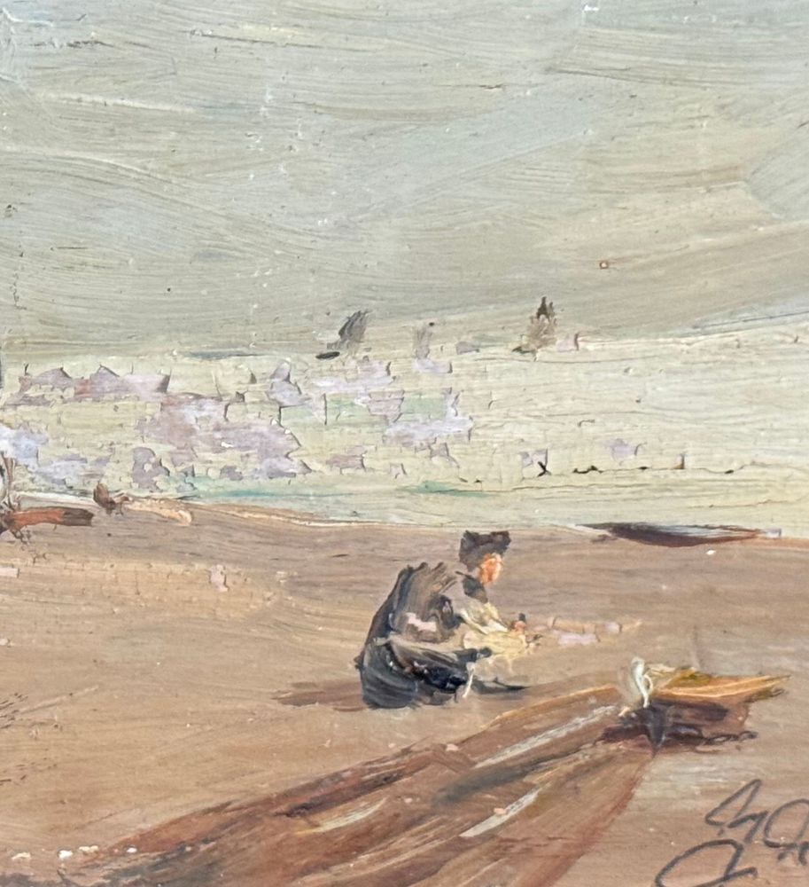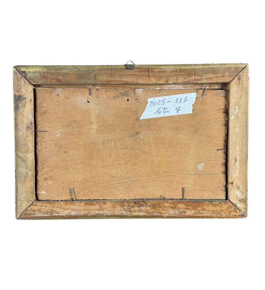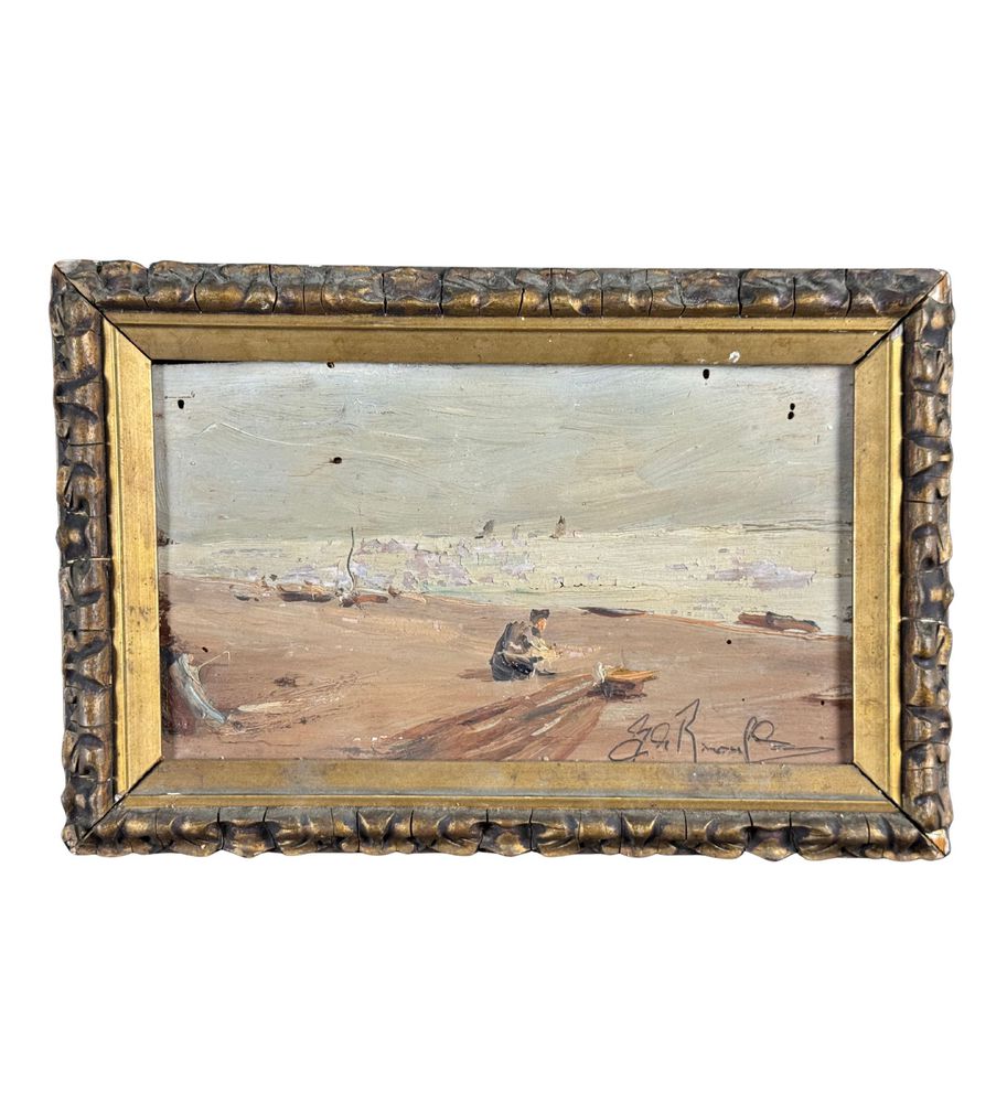 Dipinto olio su tavola, periodo XX secolo, scuola Italiana, raffigurante Scorcio di marina con personaggi. Dimensioni compreso cornice: 29x19 cm. Dimensioni interno cornice: 14x24 cm. Firmato in basso a destra da artista non identificato. Opera in buone condizioni con lievi segni di vissuto come da foto allegate.