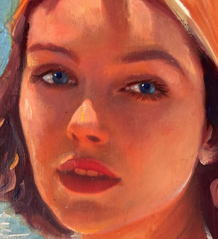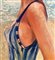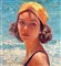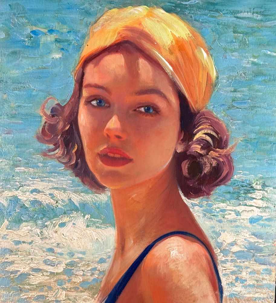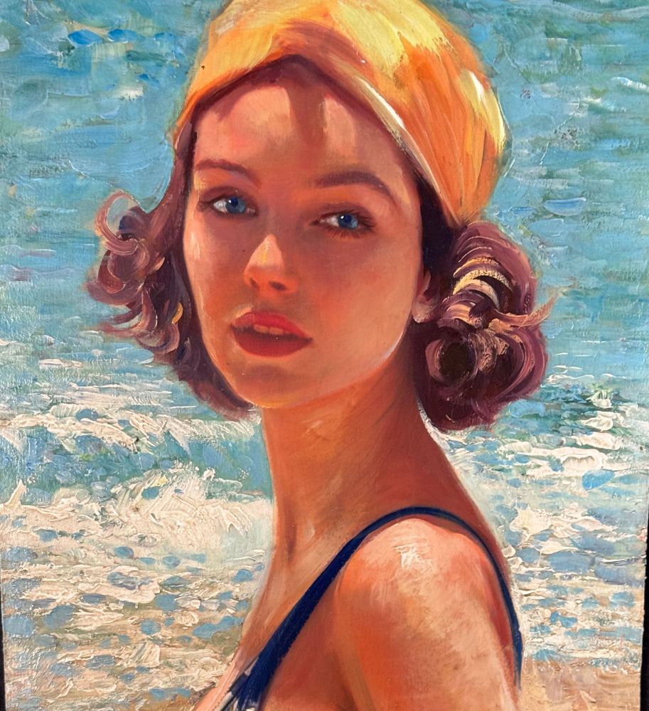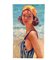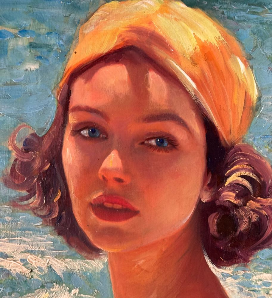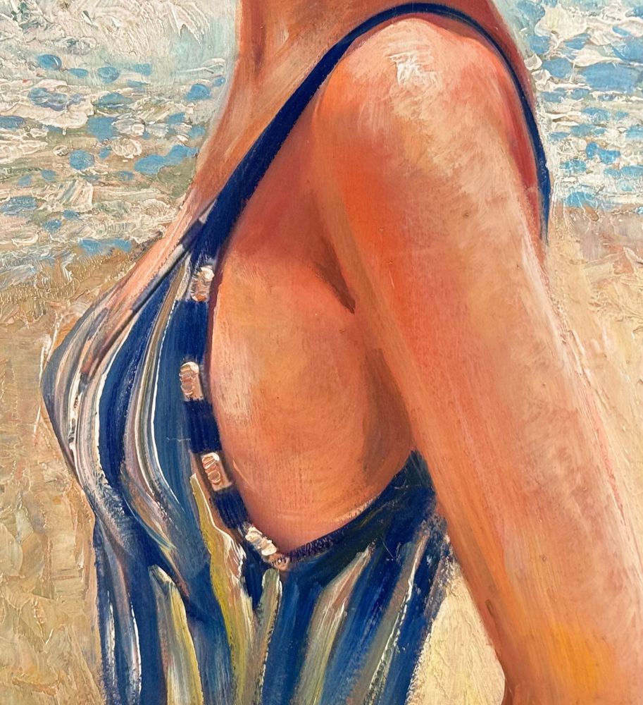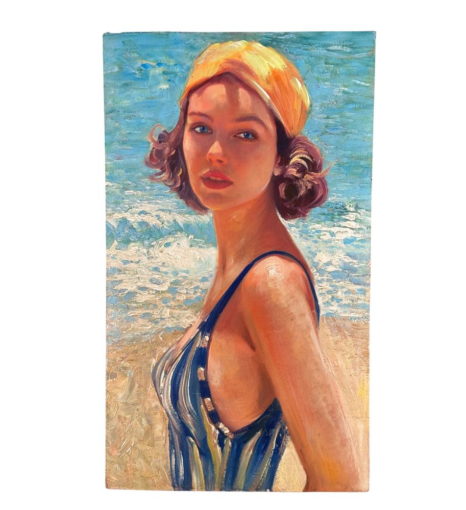 Dipinto olio su cartoncino, periodo XX secolo, scuola Italiana raffigurante Ritratto di donna in costume da bagno su marina. Dimensioni: 35x60 cm. Da artista anonimo. Opera in buone condizioni.