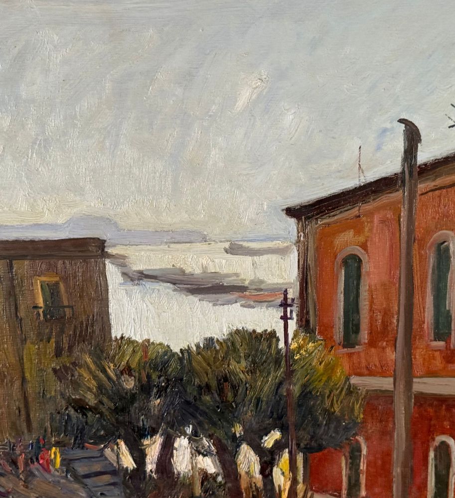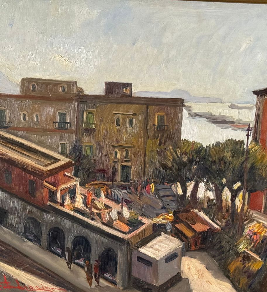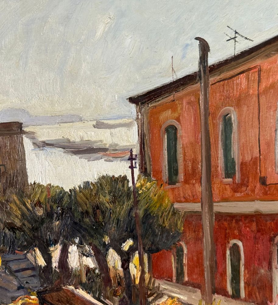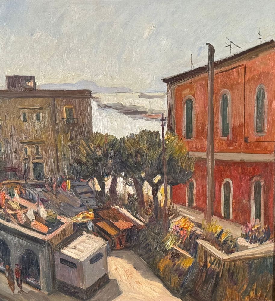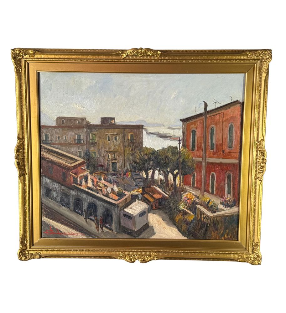 Dipinto olio su tela, periodo XX secolo, scuola Italiana raffigurante Strada con paesaggio marino. Dimensioni compreso cornice: 63x73 cm. Dimensioni interno cornice: 60x50 cm. Firmato in basso a sinistra Ferdinando Ambrosino (1938). Opera in buone condizioni.
