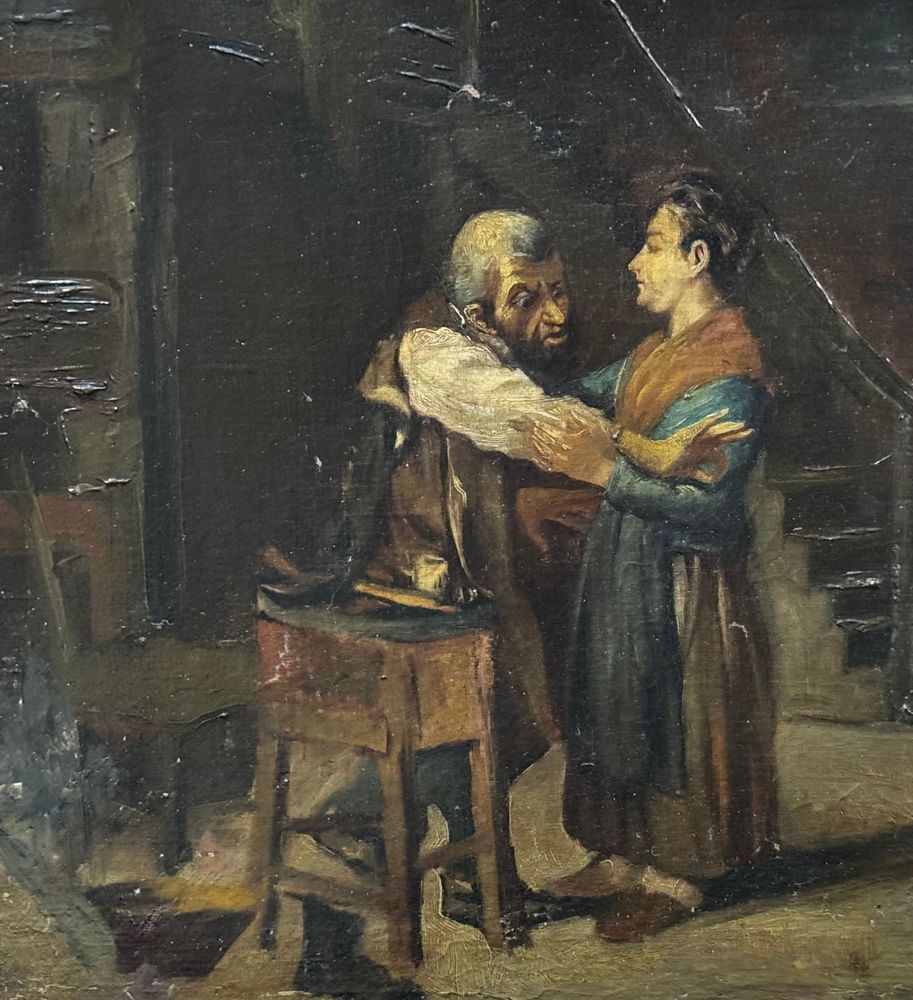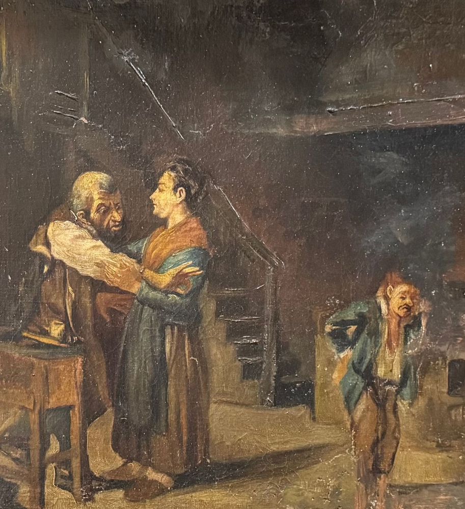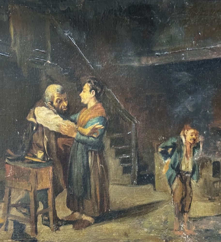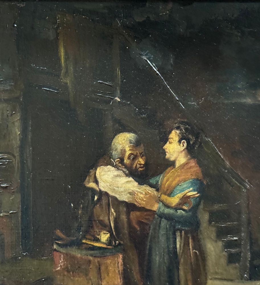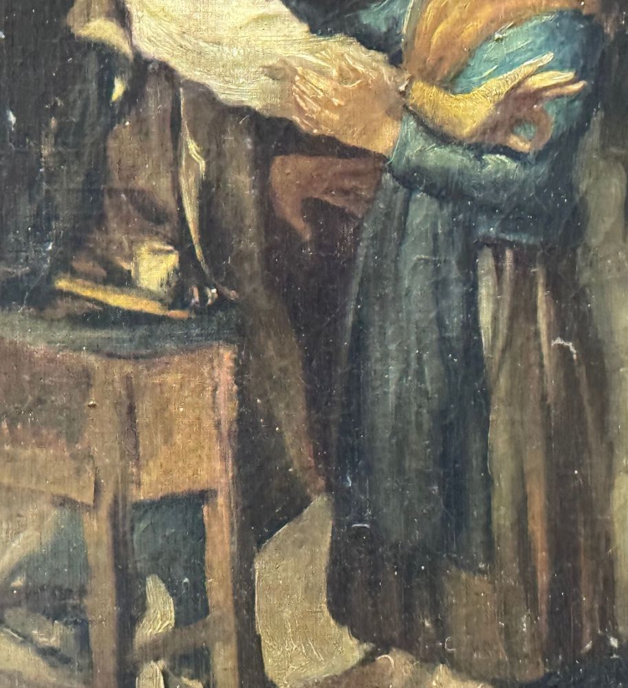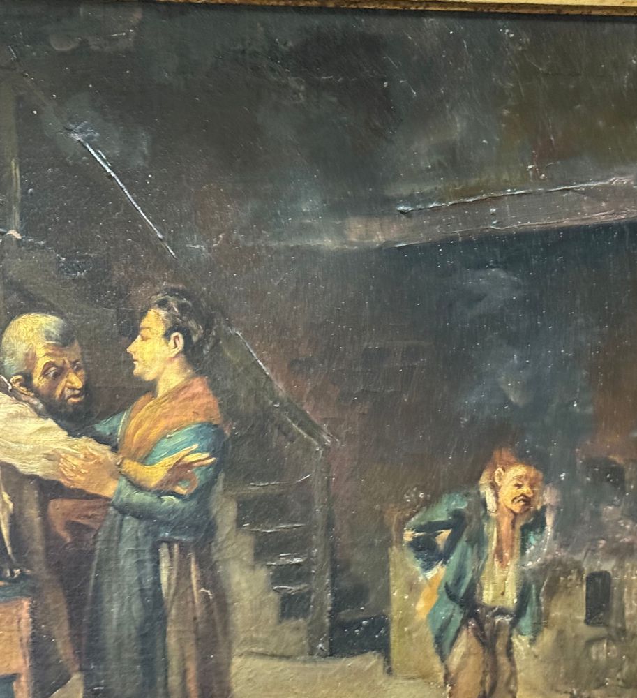 Dipinto olio su tela, periodo XIX secolo, scuola Italiana raffigurante Personaggi in un interno. Dimensioni compreso cornice: 62x52 cm. Dimensioni interno cornice: 52x41 cm. Da artista anonimo. Opera in buone condizioni con lievi segni di vissuto come da foto allegate. Da segnalare vecchio rintelo. Cornice difetti e mancanze.