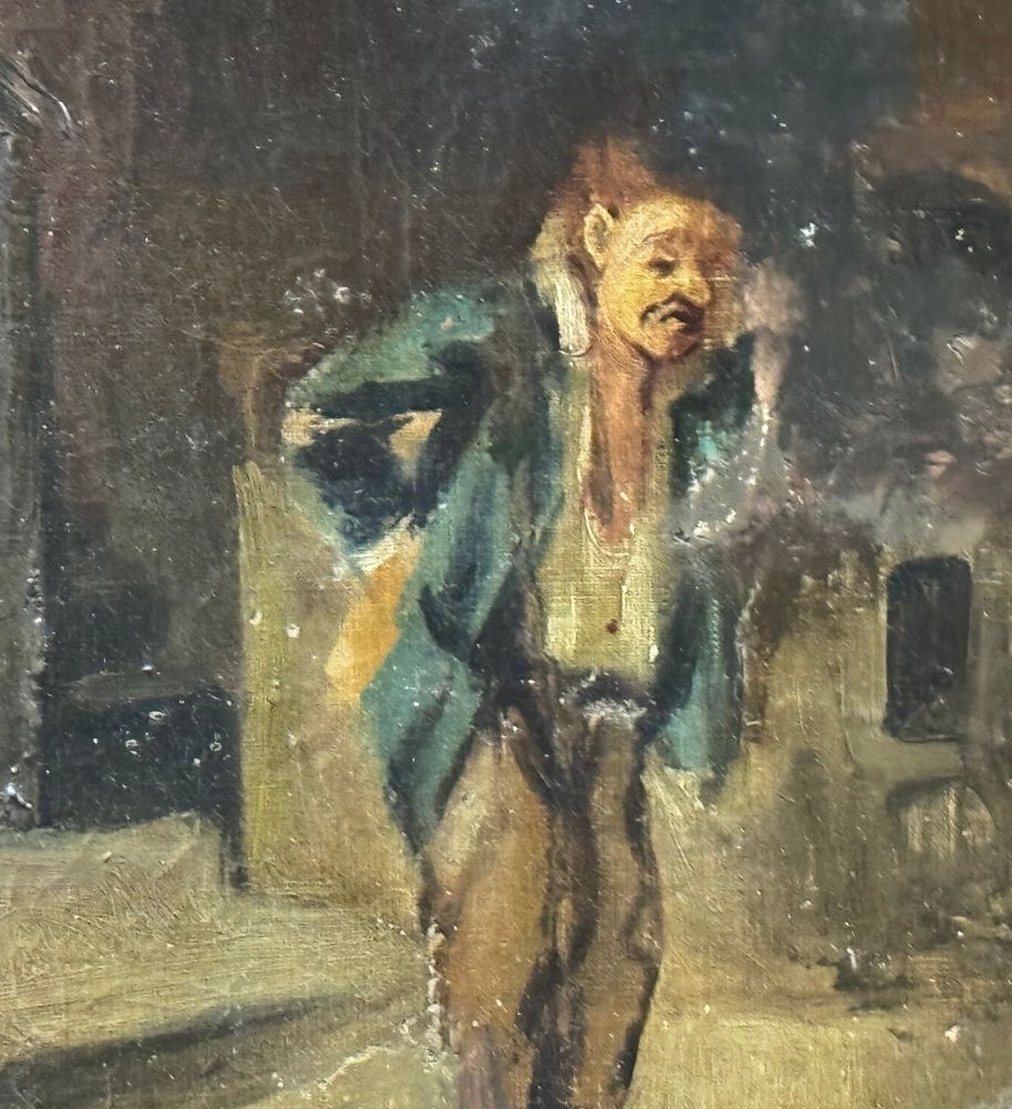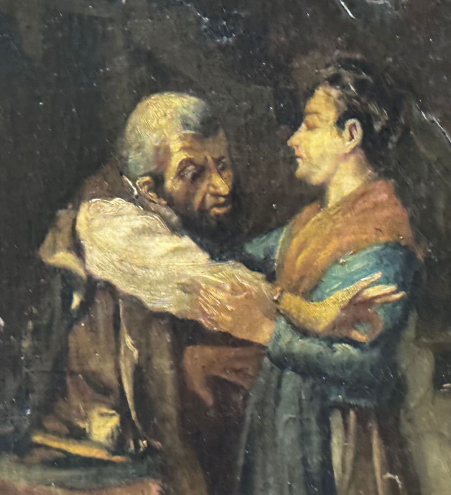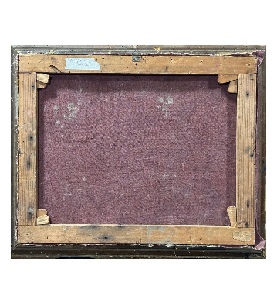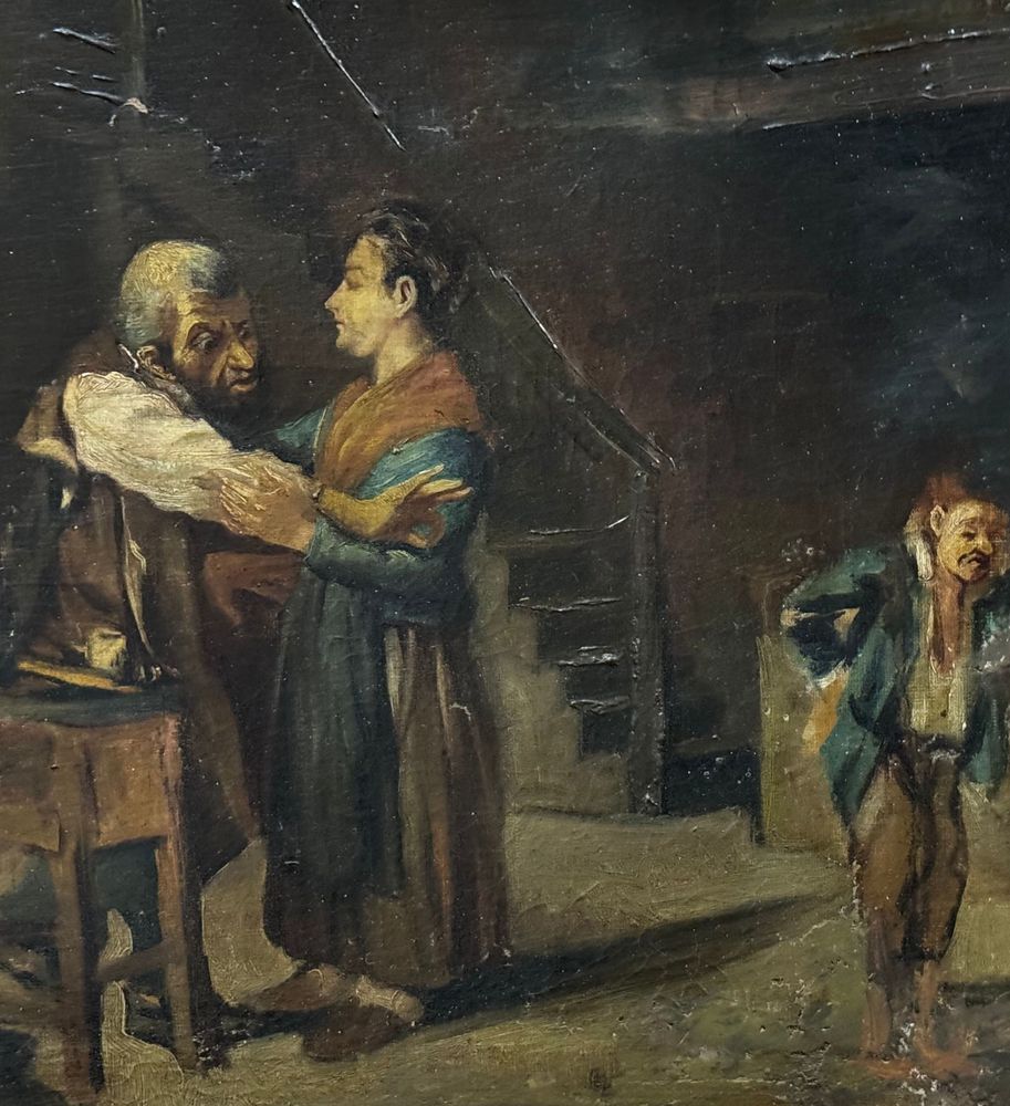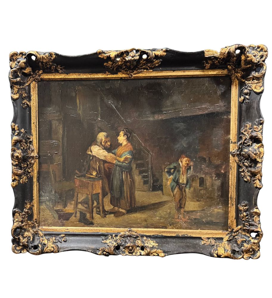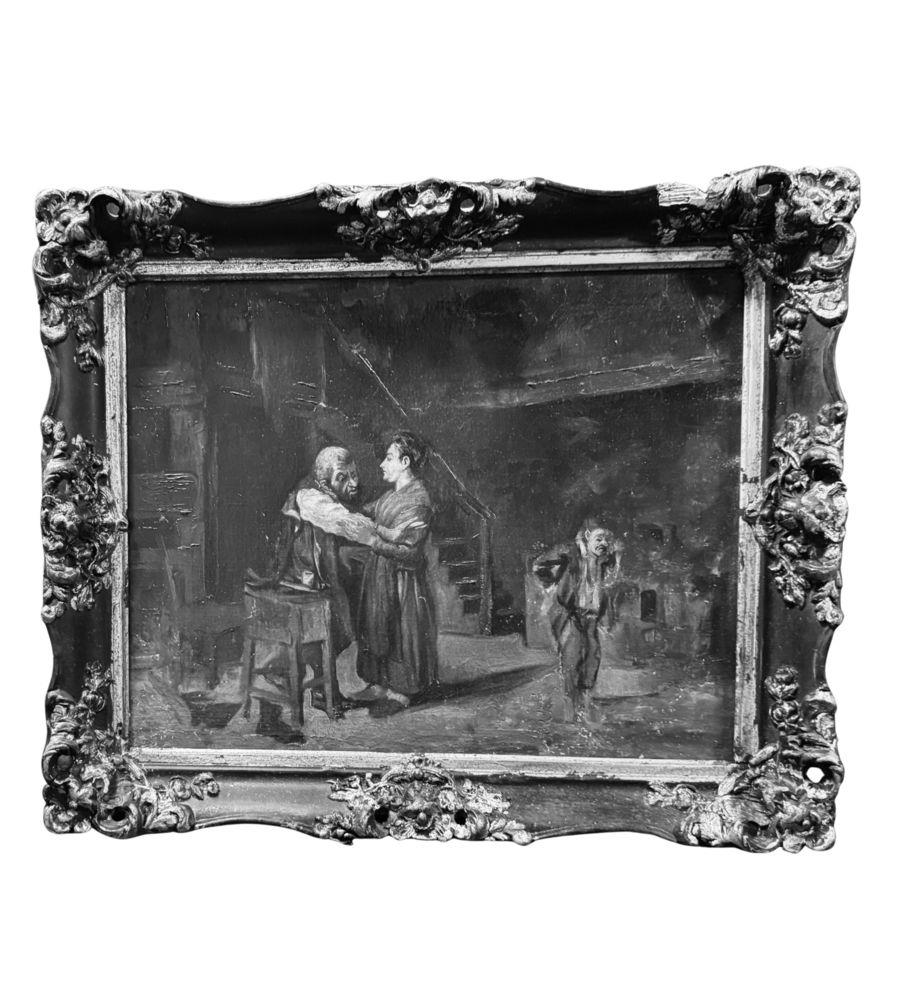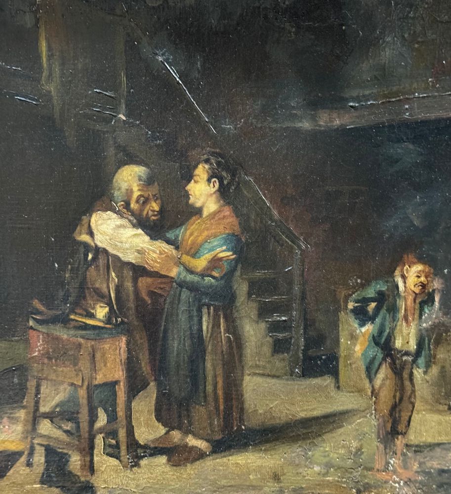 Dipinto olio su tela, periodo XIX secolo, scuola Italiana raffigurante Personaggi in un interno. Dimensioni compreso cornice: 62x52 cm. Dimensioni interno cornice: 52x41 cm. Da artista anonimo. Opera in buone condizioni con lievi segni di vissuto come da foto allegate. Da segnalare vecchio rintelo. Cornice difetti e mancanze.
