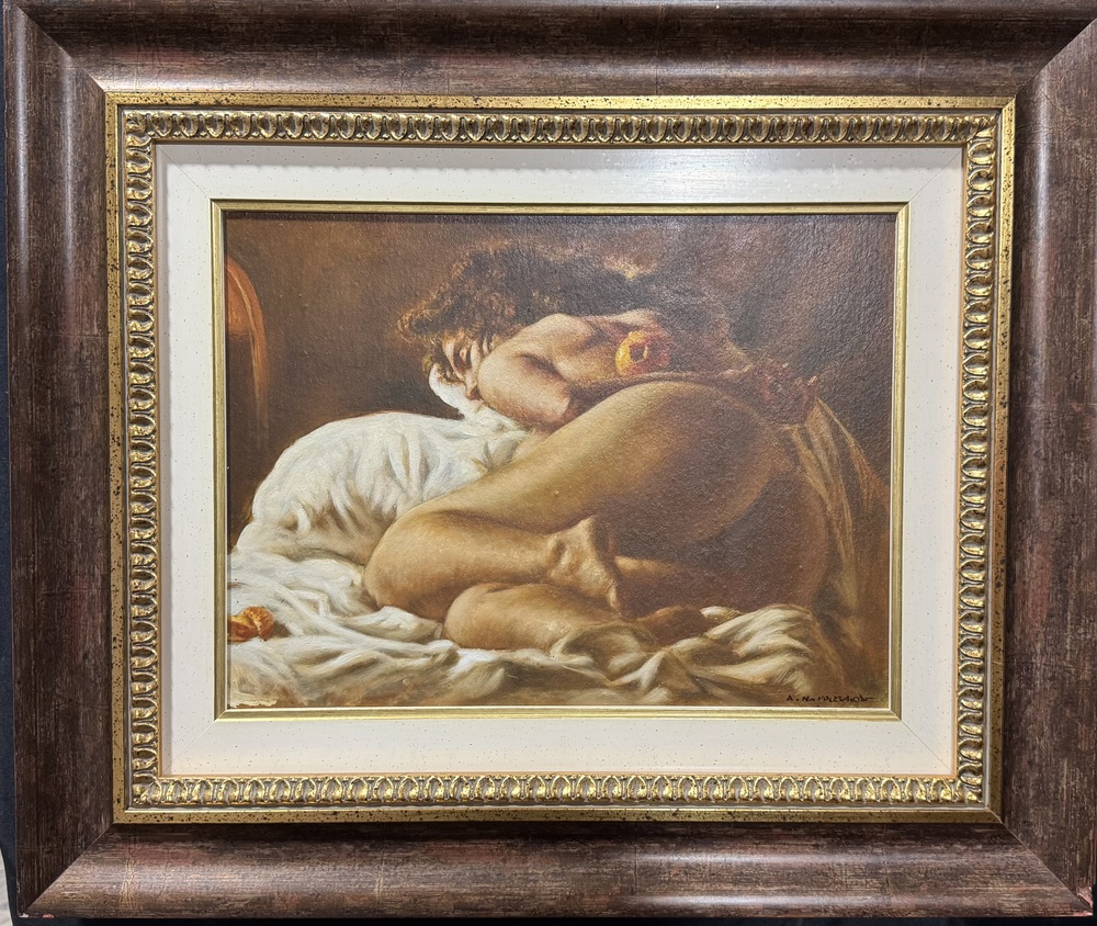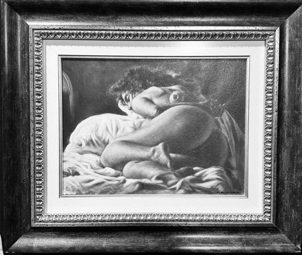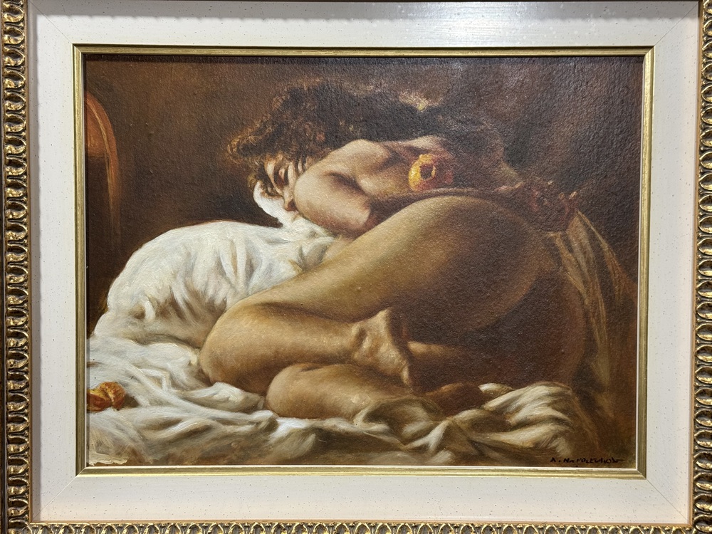 Dipinto olio su pannello, periodo XX secolo, scuola Italiana raffigurante Nudo di donna dal titolo "Dare, chiedere". Dimensioni compreso cornice: 62x52 cm. Dimensioni interno cornice: 30x40 cm. Firmato in basso a destra Antonio Napoletano Opera in buone condizioni.
