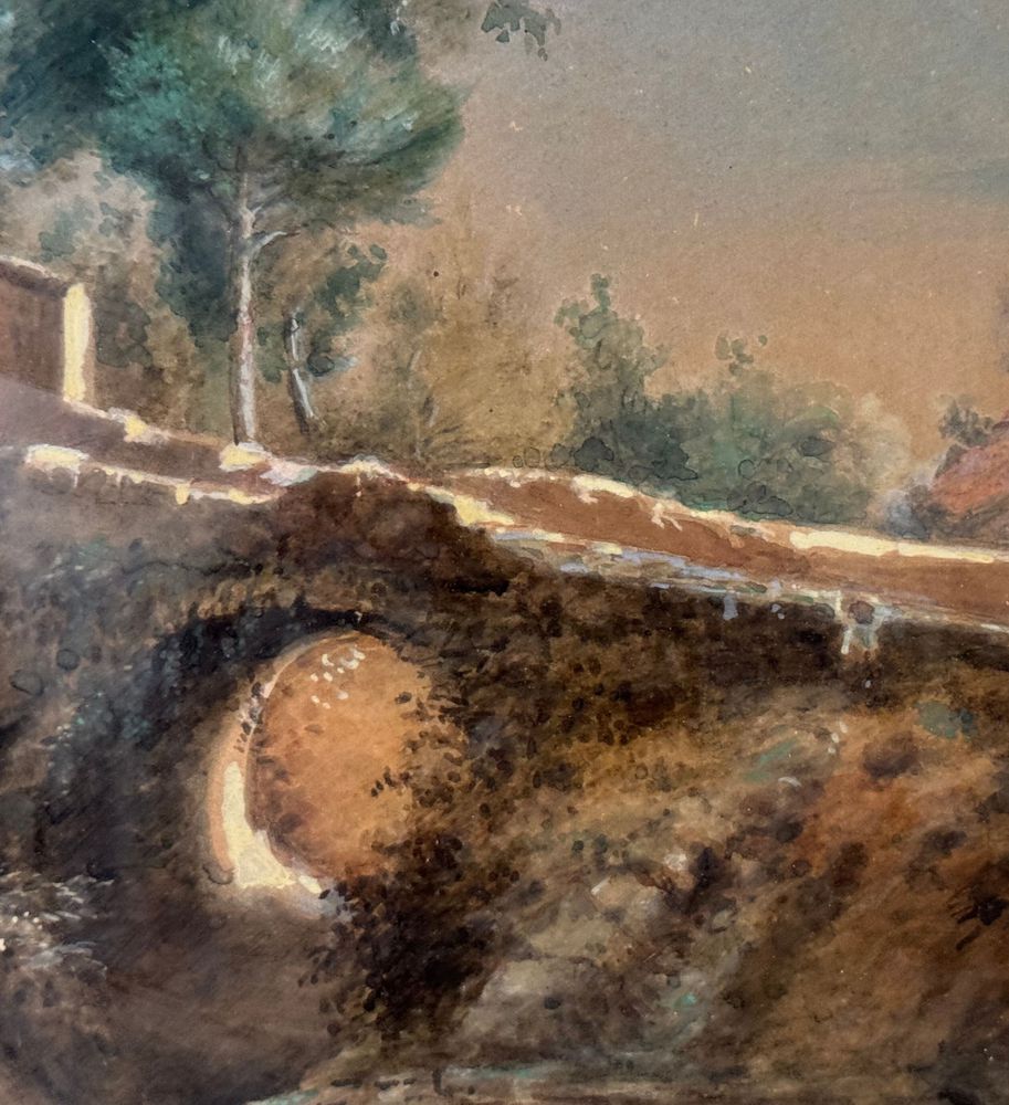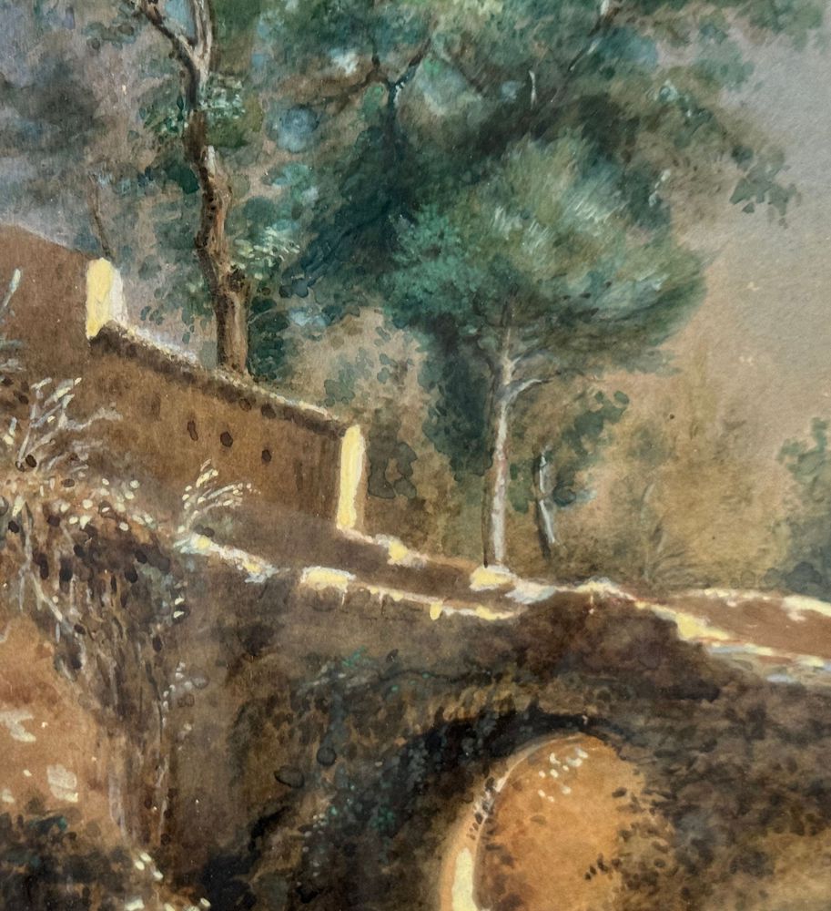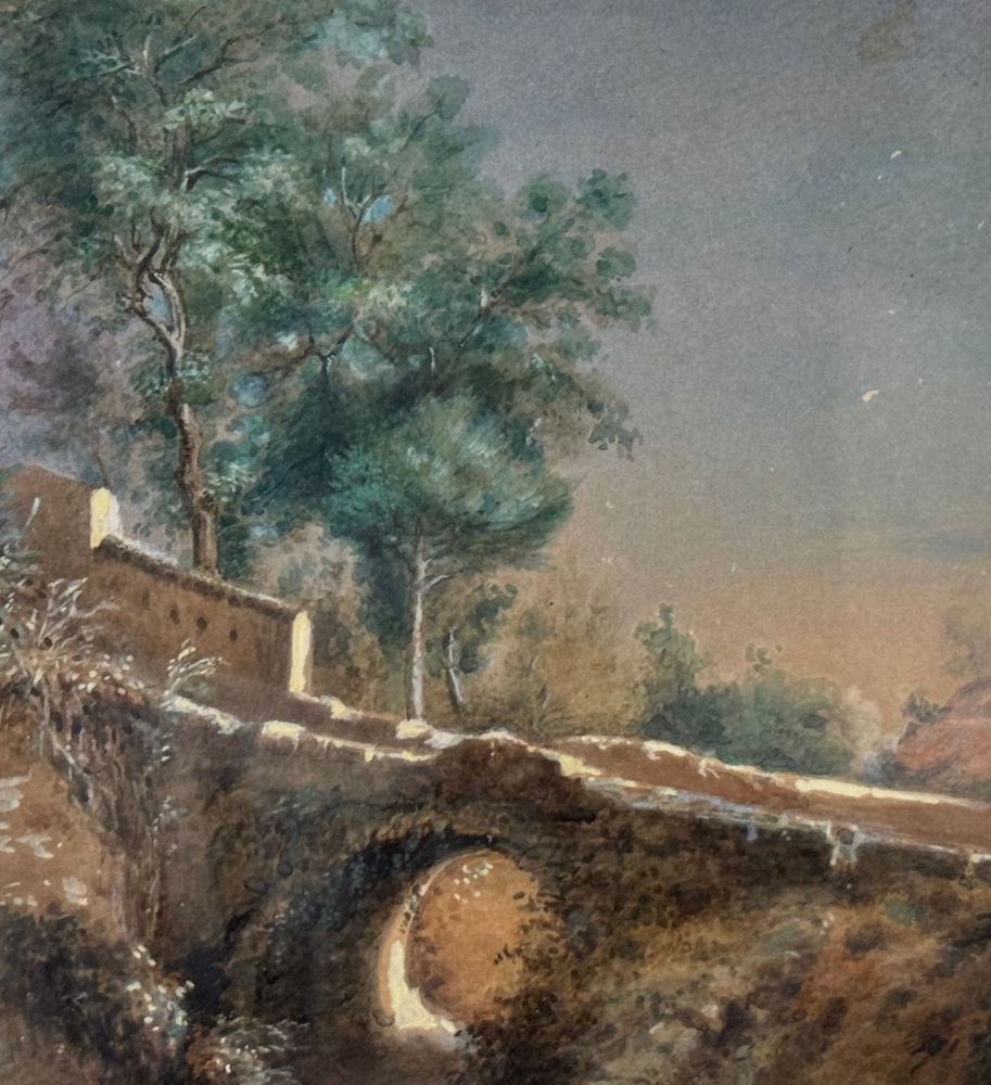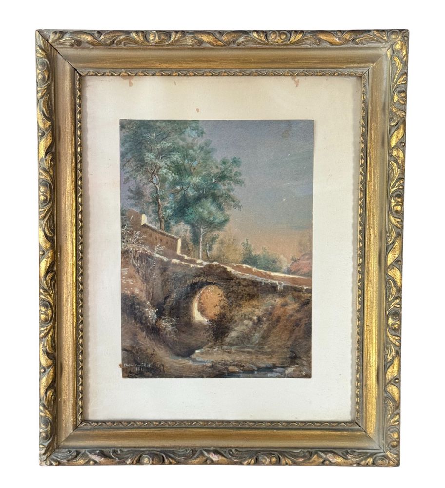 Dipinto acquerello su carta, periodo XIX secolo, scuola Italiana, raffigurante Paesaggio con ponte. Dimensioni compreso cornice: 41x49 cm. Dimensioni interno cornice: 22x30 cm. Firmato in basso a sinistra artista non identificato. Opera in buone condizioni.