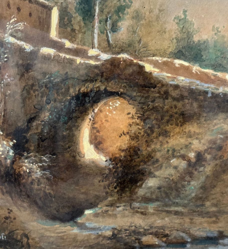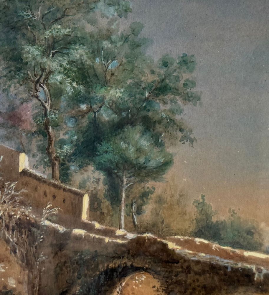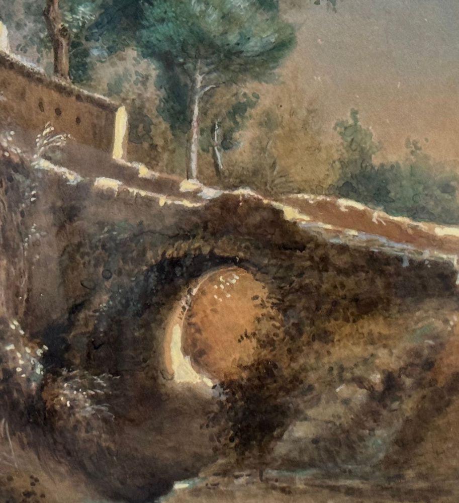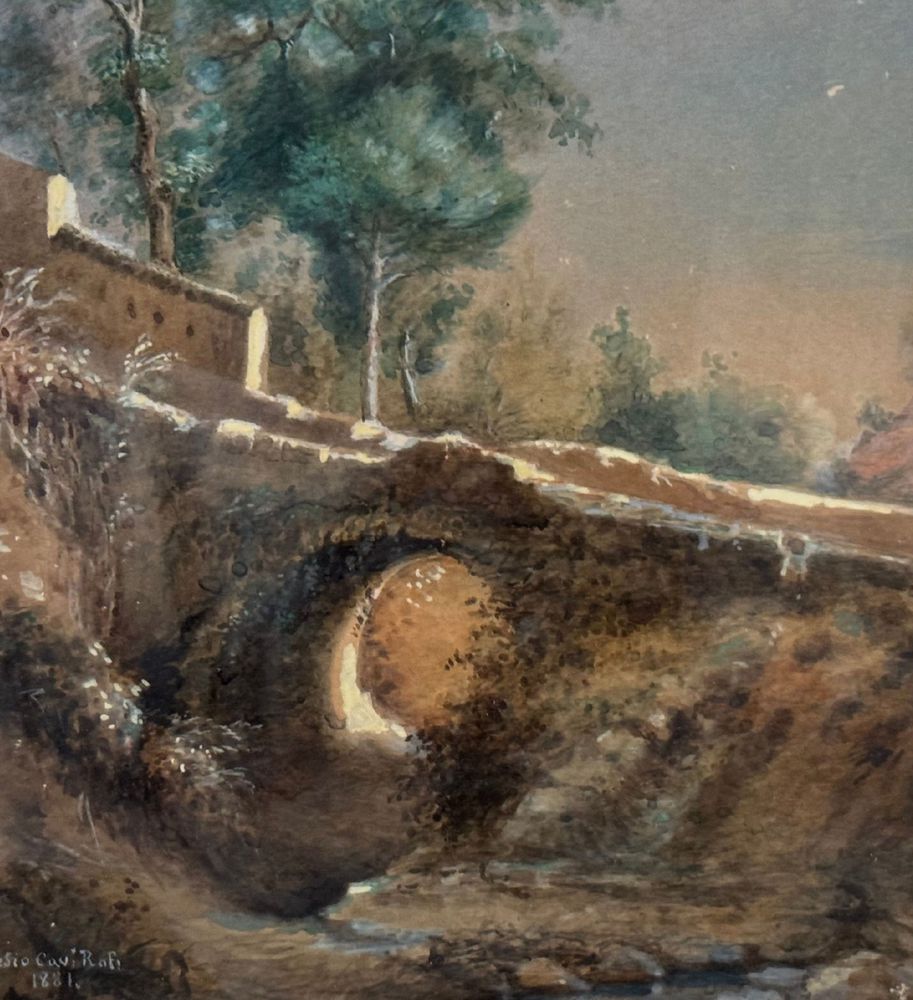 Dipinto acquerello su carta, periodo XIX secolo, scuola Italiana, raffigurante Paesaggio con ponte. Dimensioni compreso cornice: 41x49 cm. Dimensioni interno cornice: 22x30 cm. Firmato in basso a sinistra artista non identificato. Opera in buone condizioni.