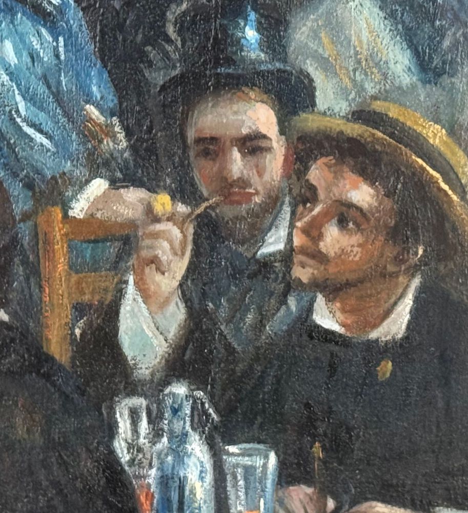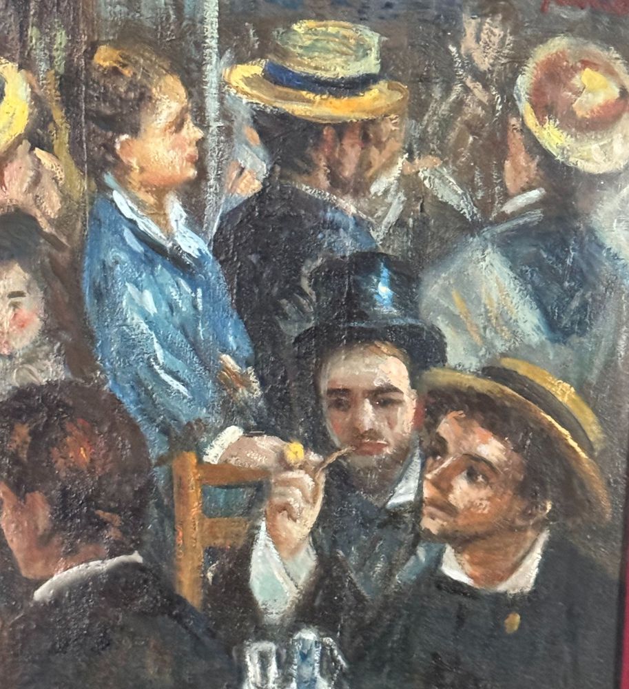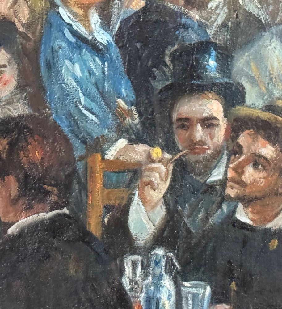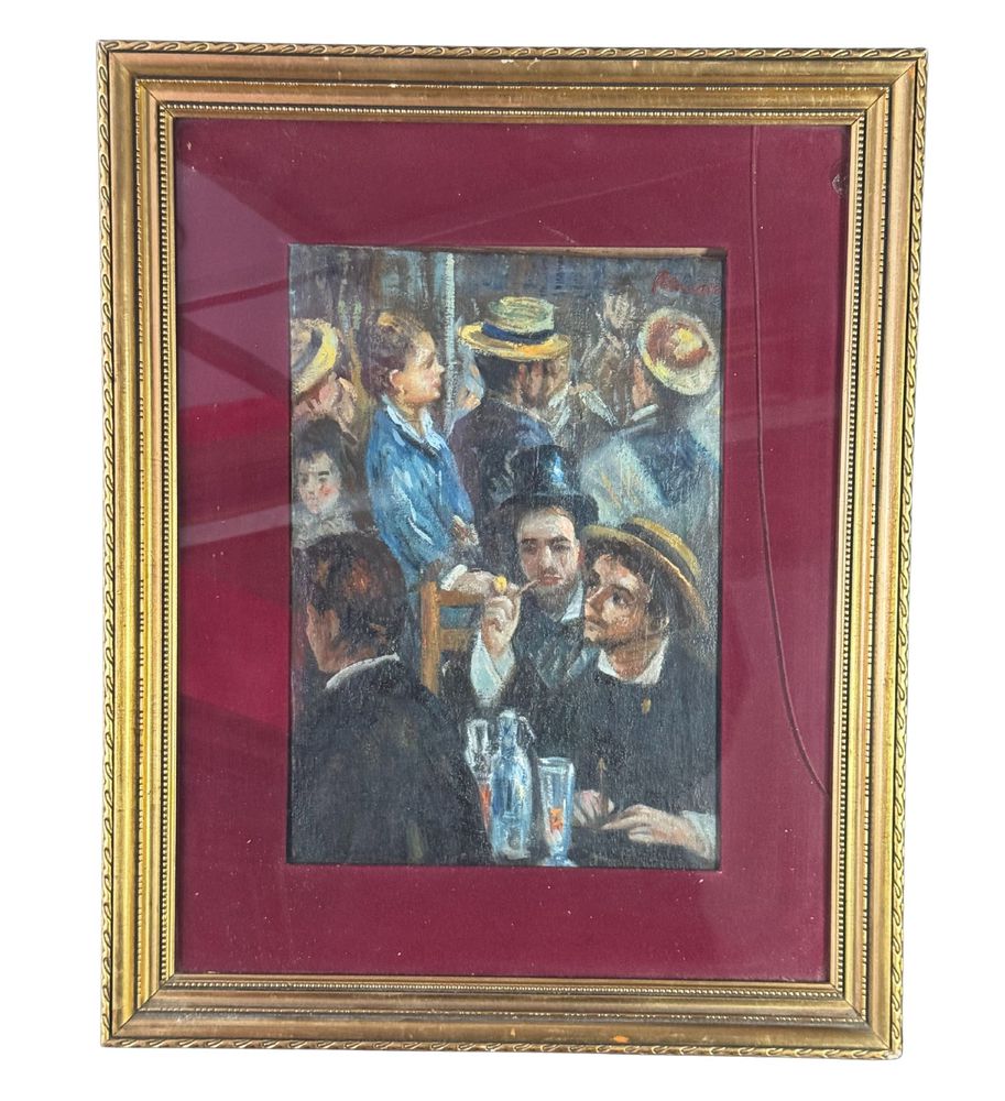 Dipinto olio su tela, periodo XX secolo, scuola Italiana, raffigurante Personaggi al Bistrot. Dimensioni compreso cornice: 42x52 cm. Dimensioni interno cornice: 23x33 cm. Artista anonimo. Opera in buone condizioni.