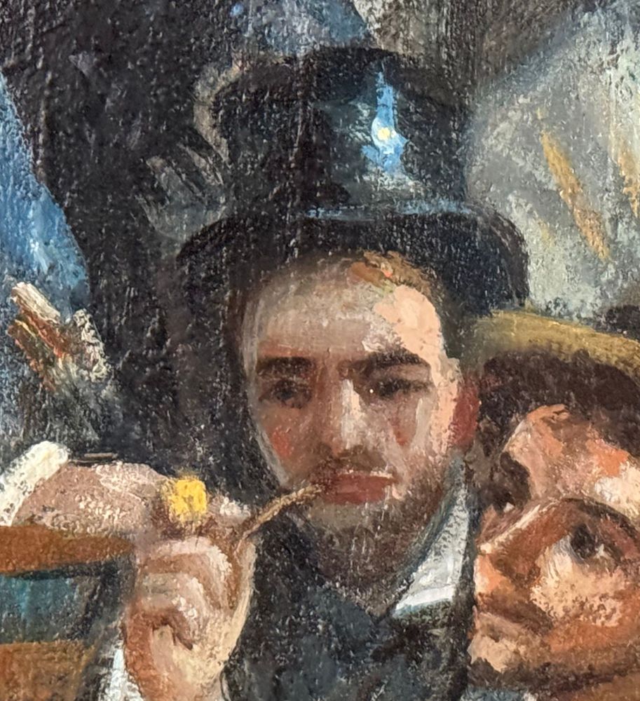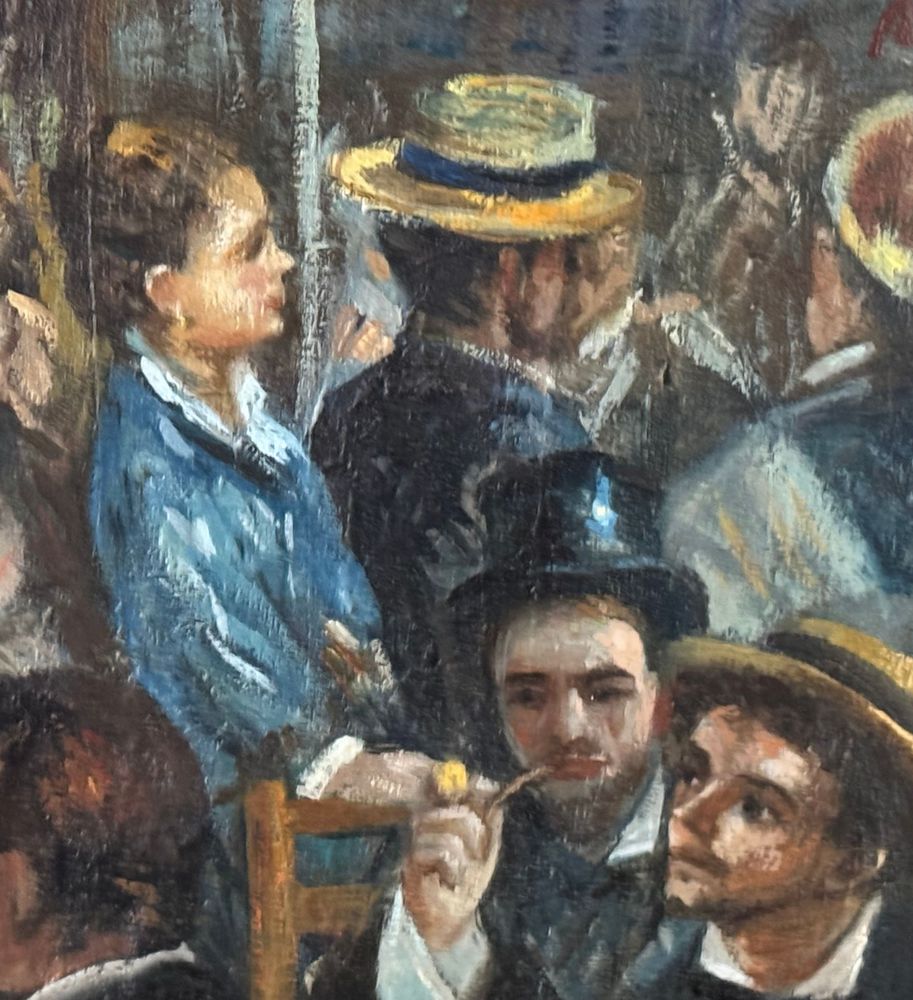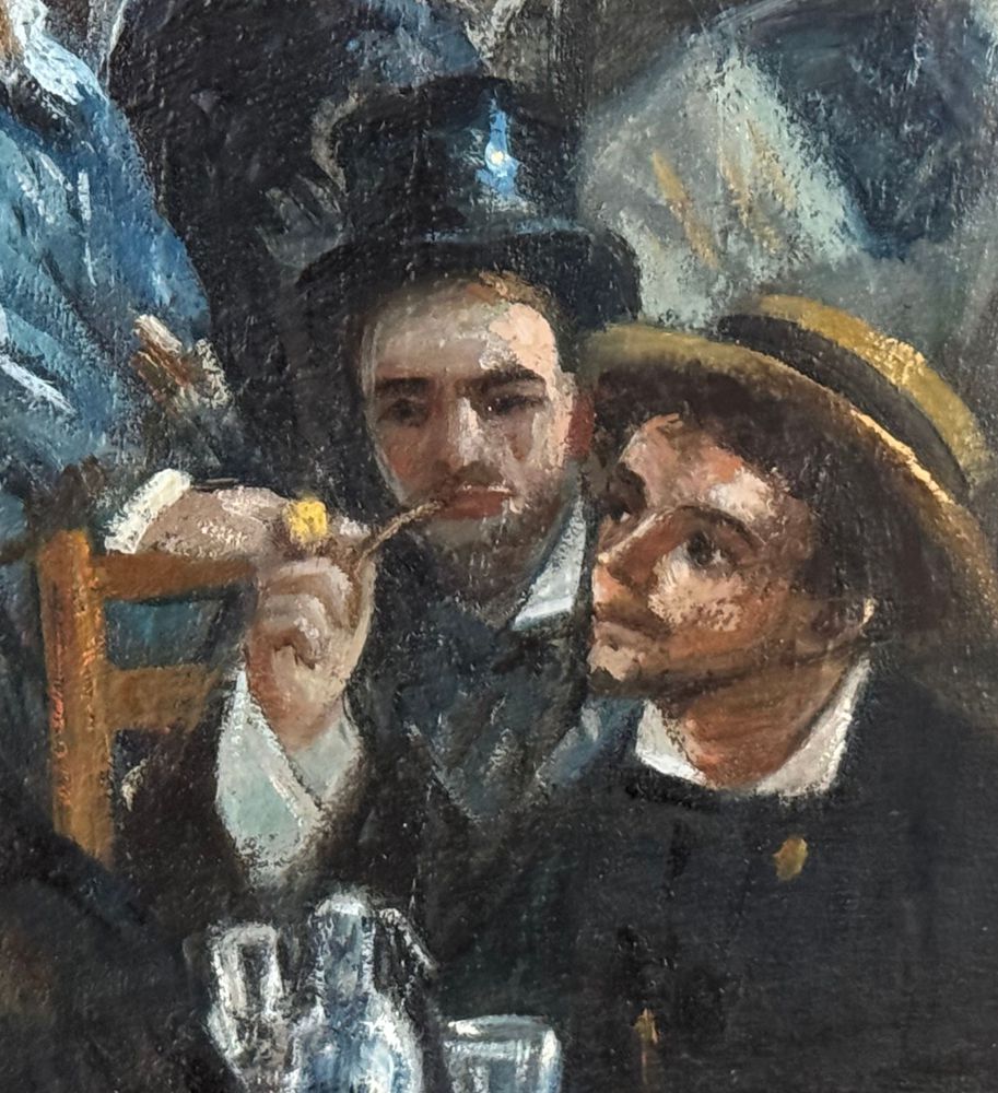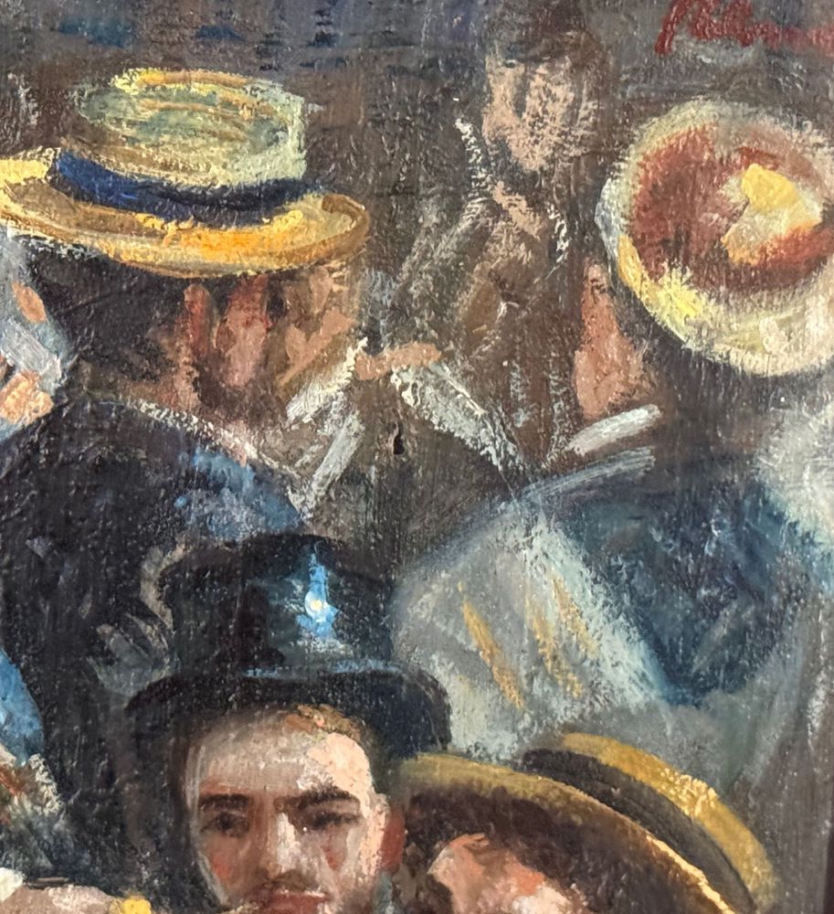 Dipinto olio su tela, periodo XX secolo, scuola Italiana, raffigurante Personaggi al Bistrot. Dimensioni compreso cornice: 42x52 cm. Dimensioni interno cornice: 23x33 cm. Artista anonimo. Opera in buone condizioni.
