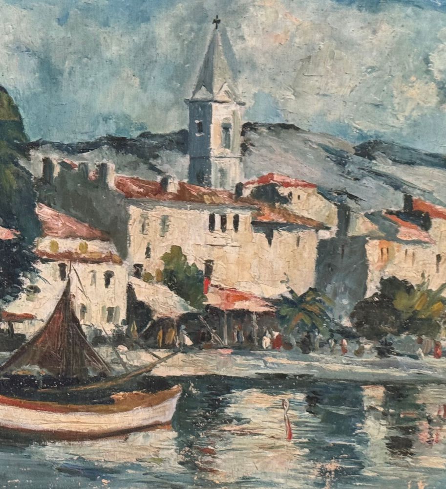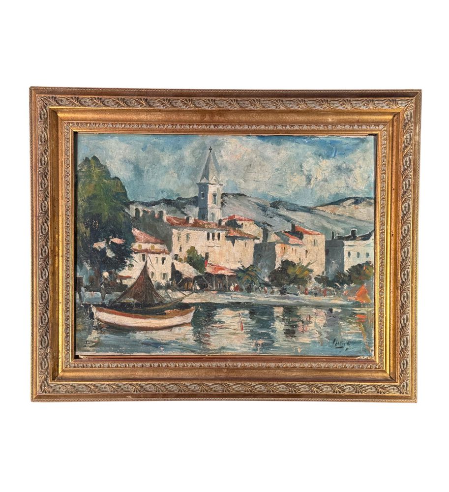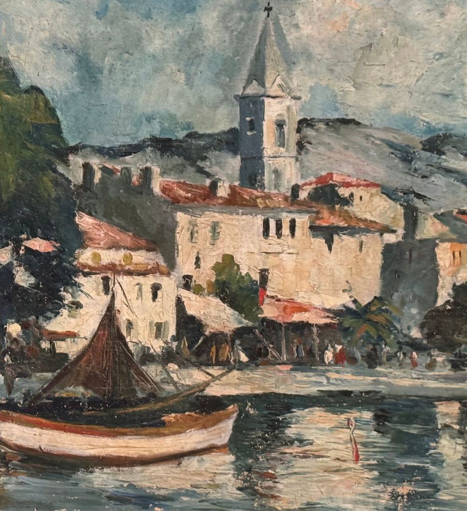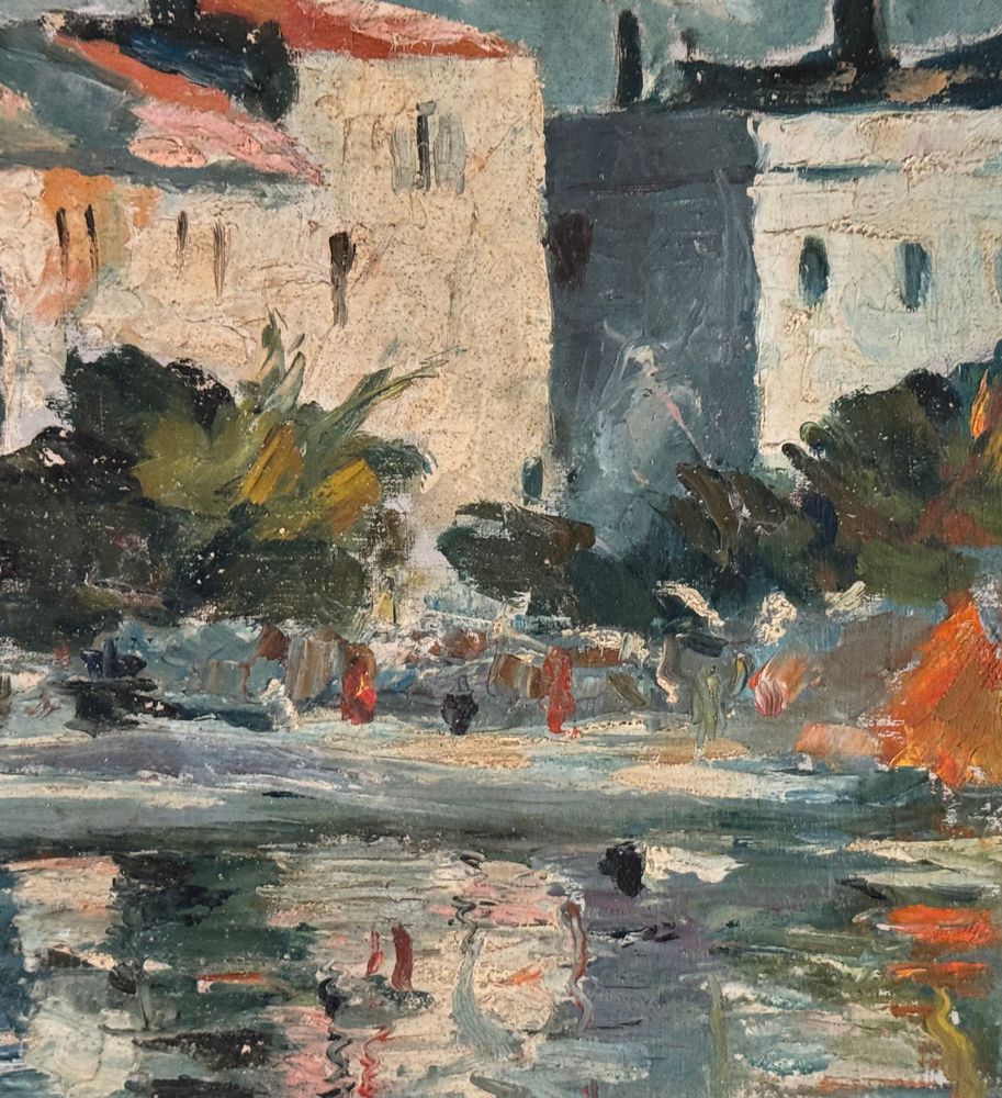 Dipinto olio su tela, periodo XX secolo, scuola Italiana, raffigurante Paesaggio marino con personaggi. Dimensioni compreso cornice: 81x66 cm. Dimensioni interno cornice: 63x46 cm. Traccia di firma in basso a destra artista non identificato. Opera in buone condizioni.