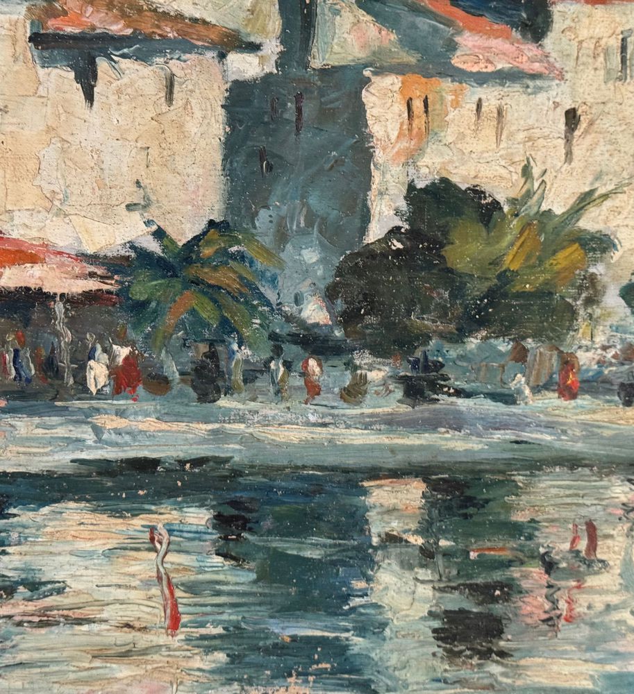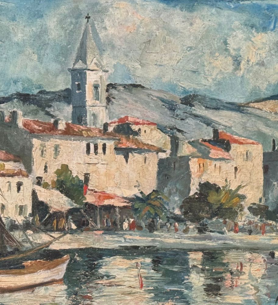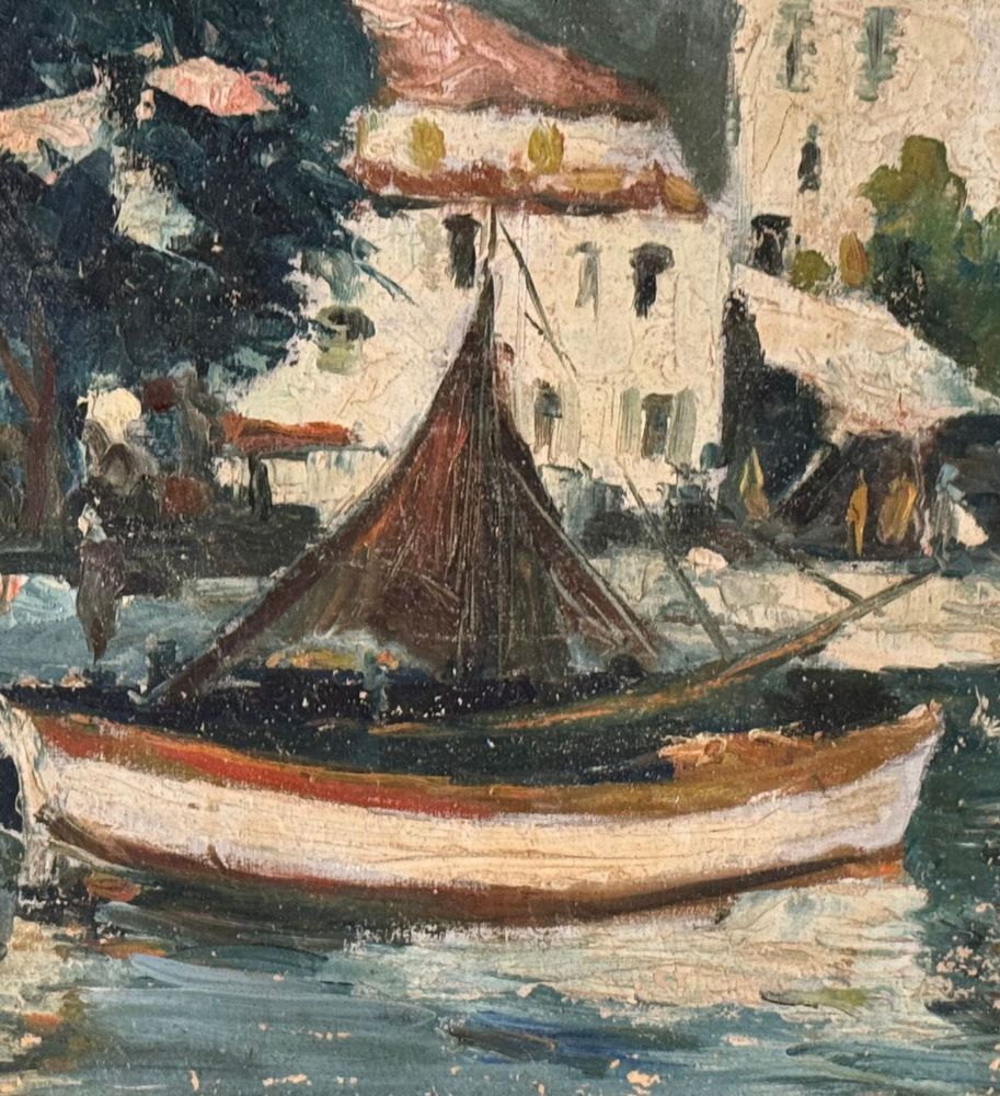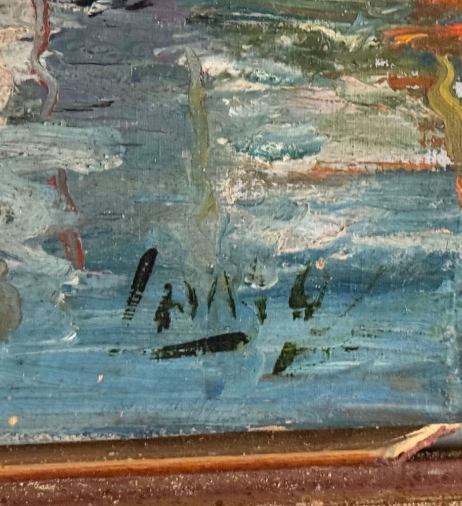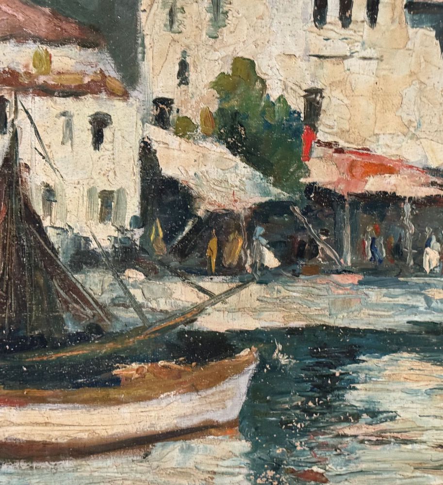 Dipinto olio su tela, periodo XX secolo, scuola Italiana, raffigurante Paesaggio marino con personaggi. Dimensioni compreso cornice: 81x66 cm. Dimensioni interno cornice: 63x46 cm. Traccia di firma in basso a destra artista non identificato. Opera in buone condizioni.