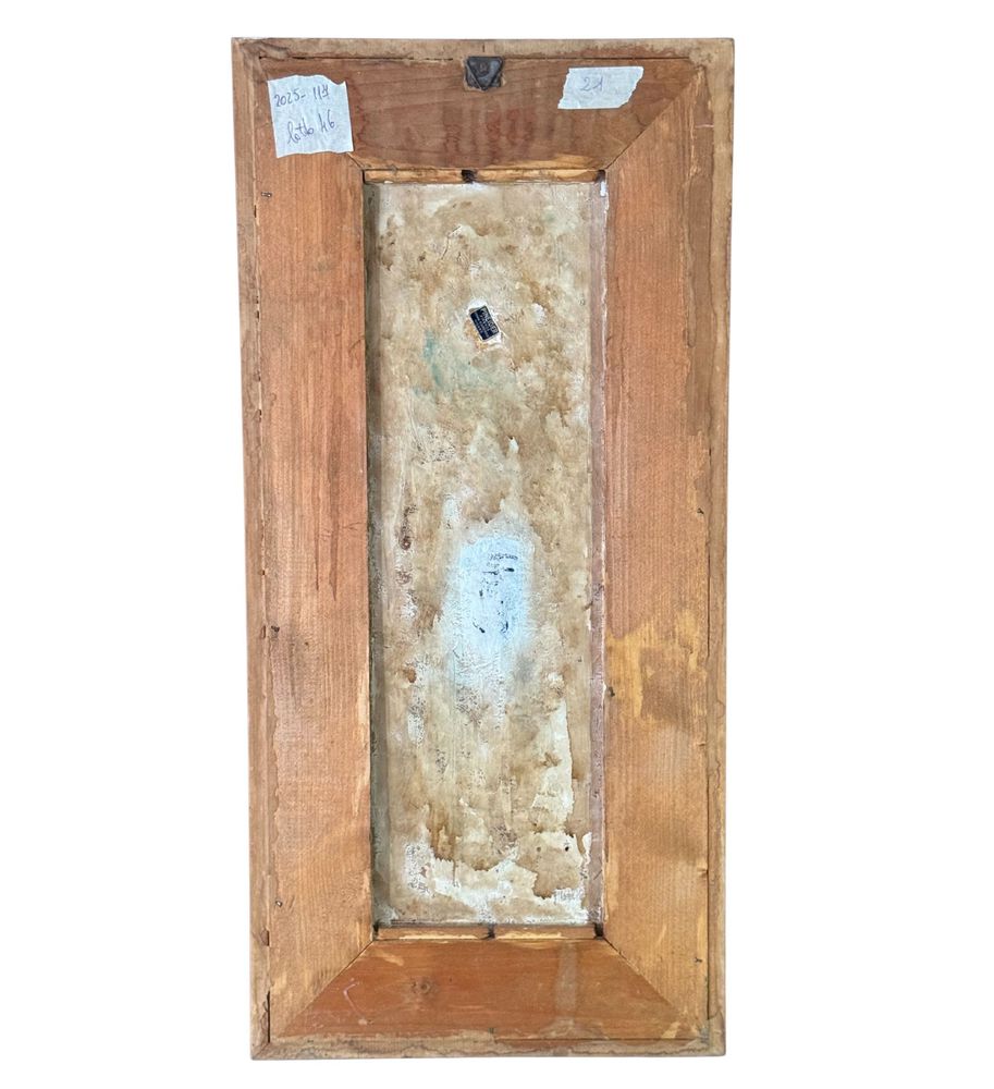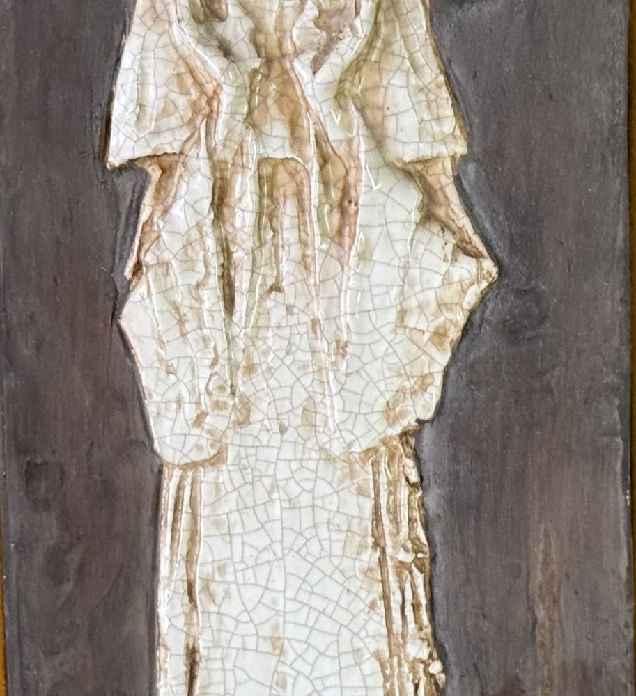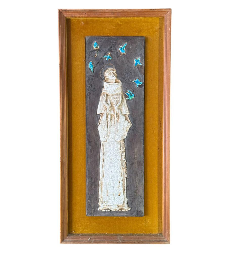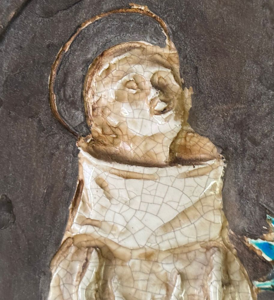 Scultura in ceramica, periodo XX secolo raffigurante Personaggio religioso. Dimensioni compreso: 31x66 cm. Interno: 52x17 cm. Buone condizioni.