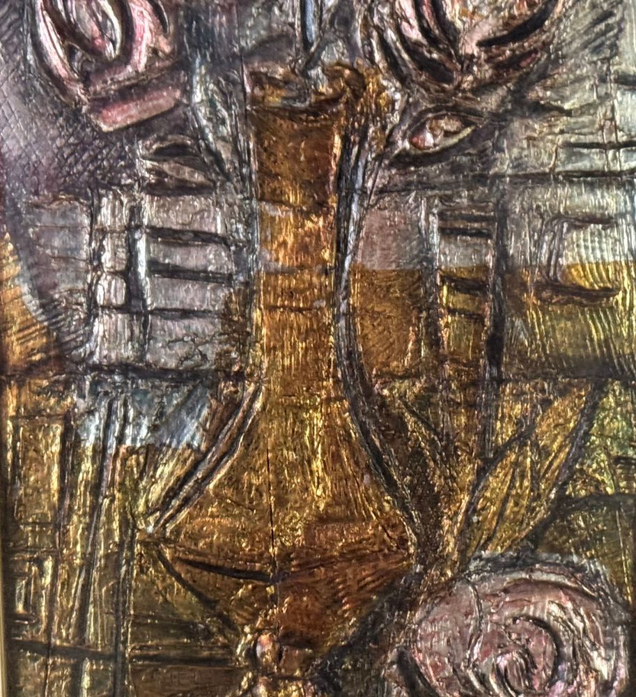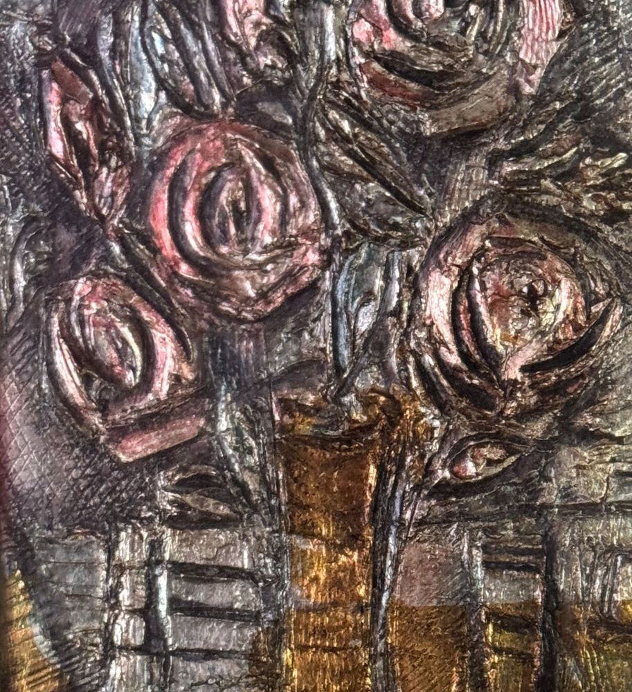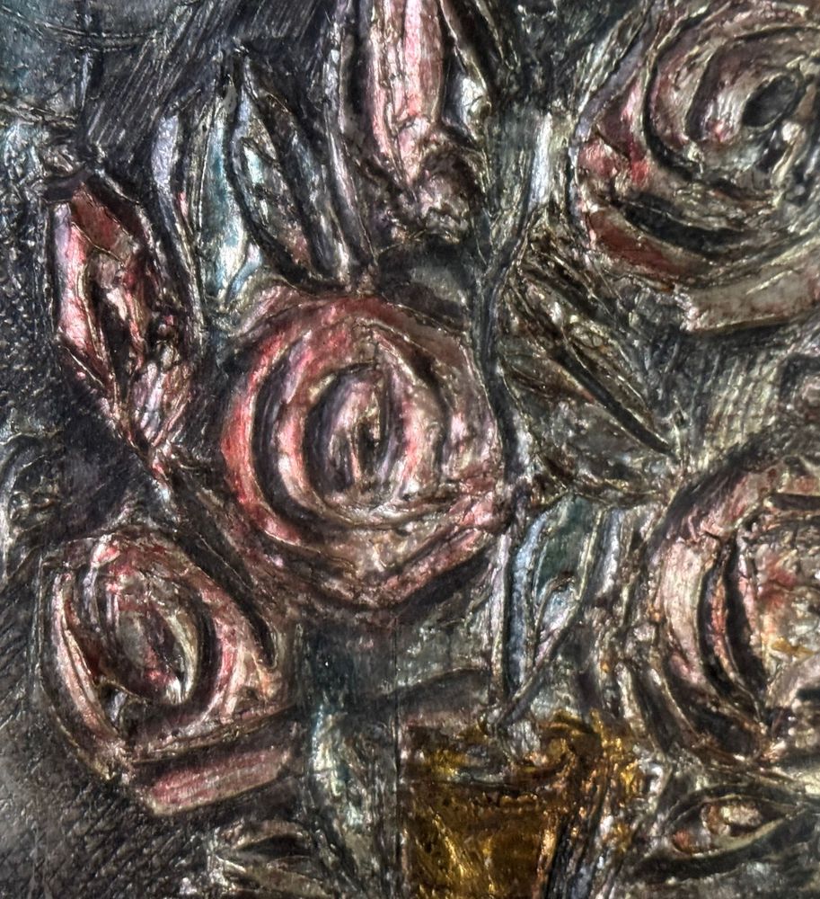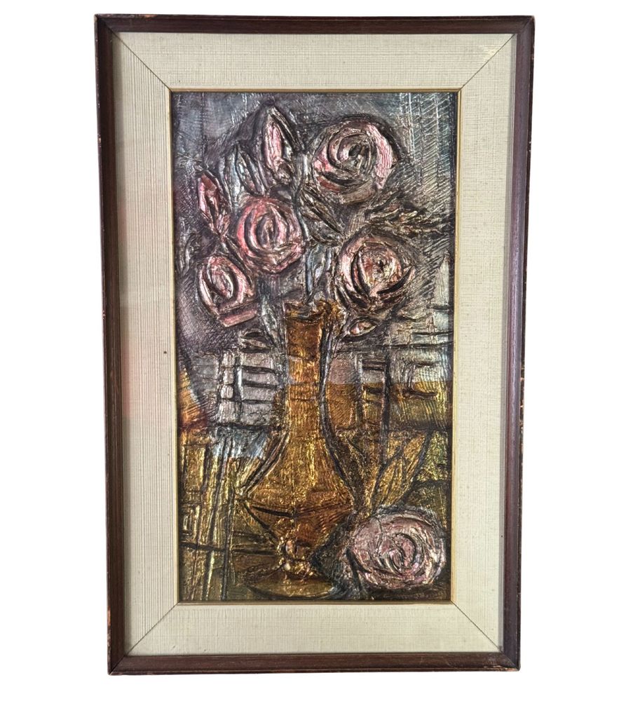 Tecnica mista su tavola a basso rilievo, periodo XX secolo, raffigurante Vaso con fiori. Dimensioni compreso: 64x41 cm. Interno: 50x27 cm. In buone condizioni. Firmato in basso a sinistra Mele.