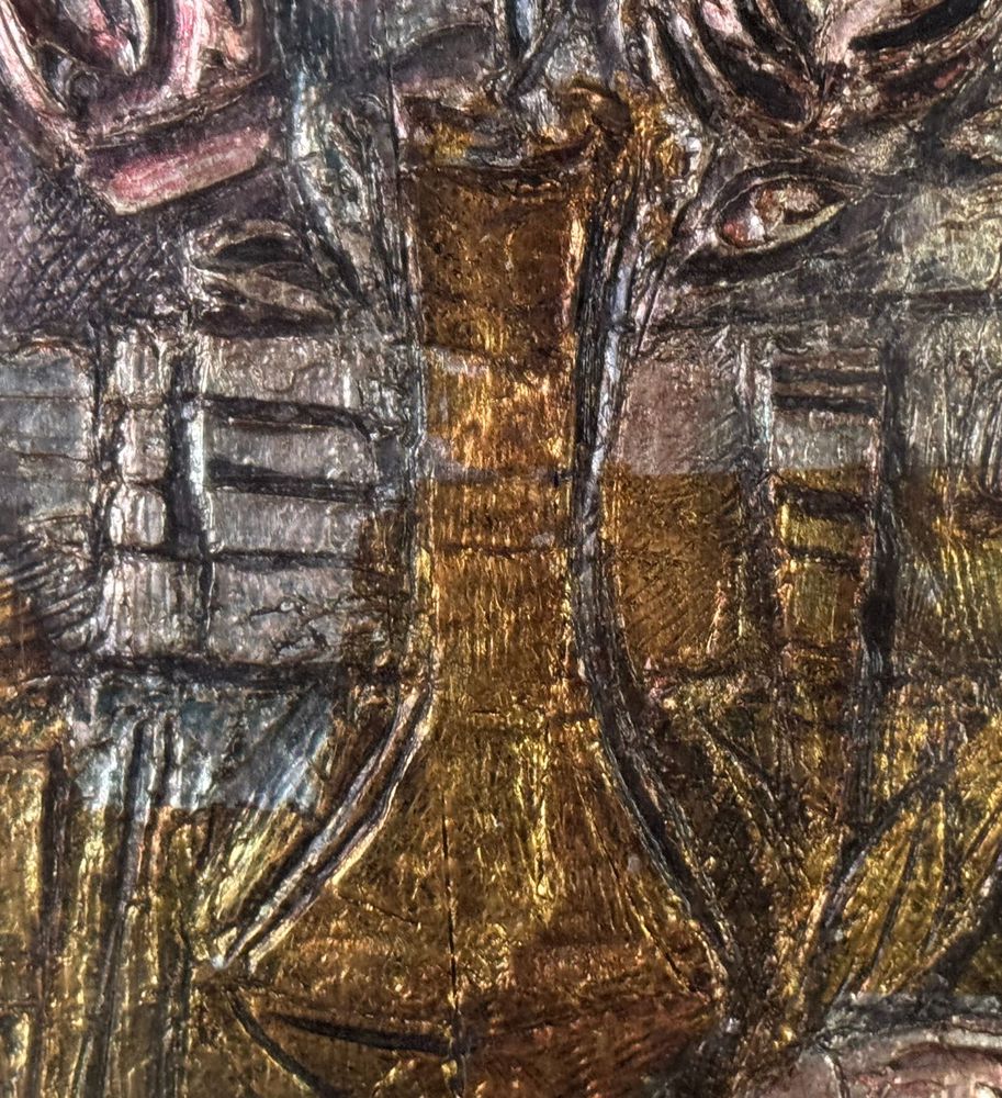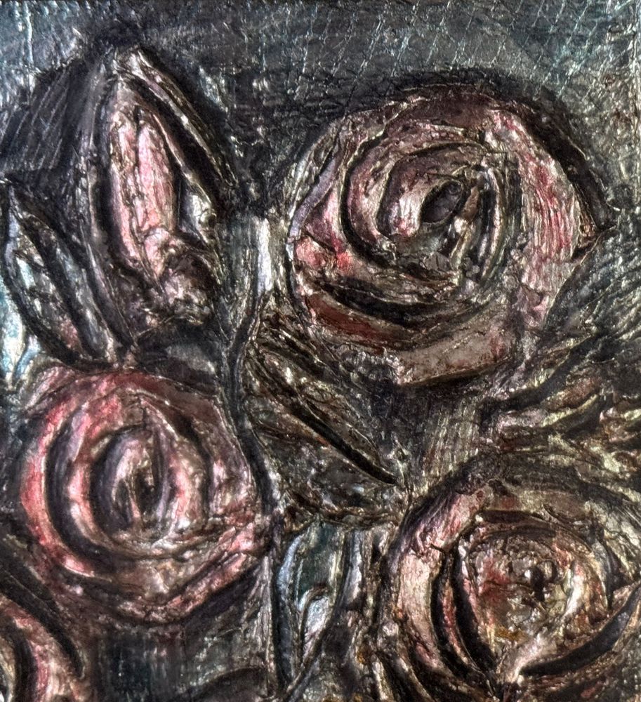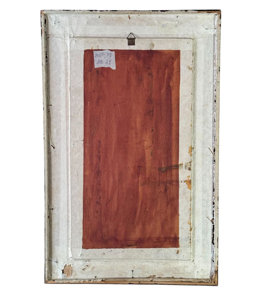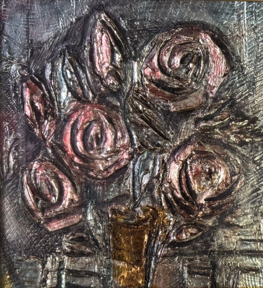 Tecnica mista su tavola a basso rilievo, periodo XX secolo, raffigurante Vaso con fiori. Dimensioni compreso: 64x41 cm. Interno: 50x27 cm. In buone condizioni. Firmato in basso a sinistra Mele.