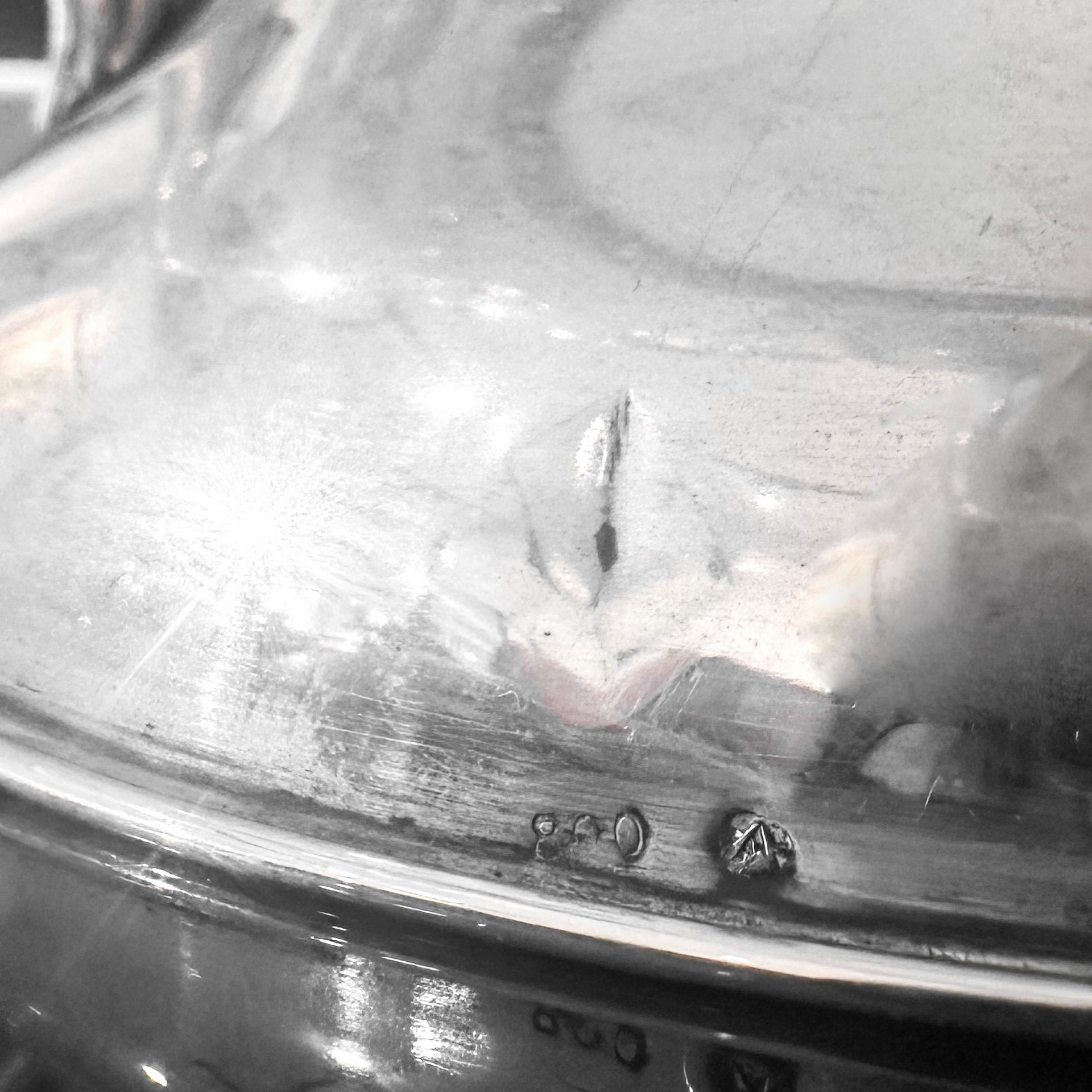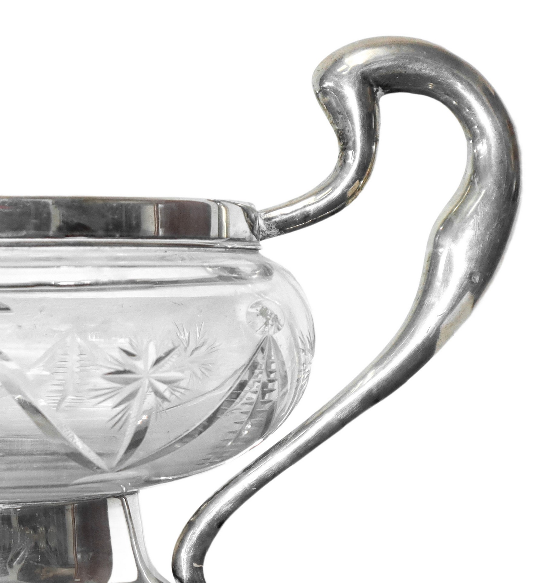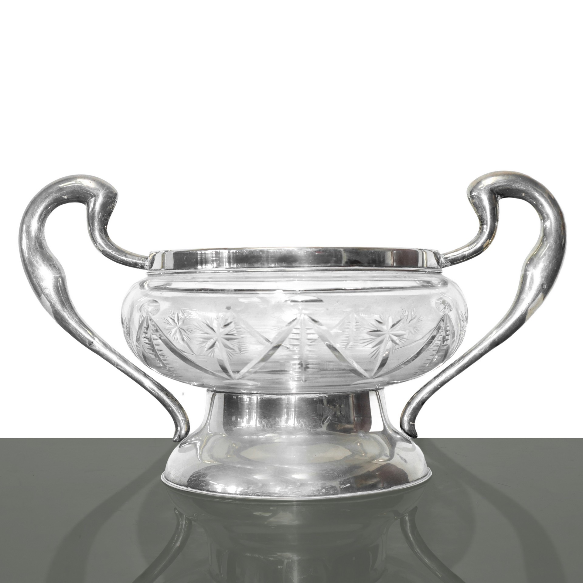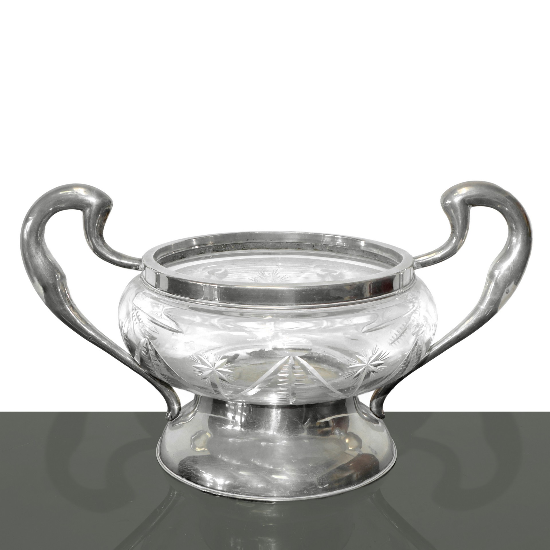 Centrotavola in cristallo molato con base e manici in argento