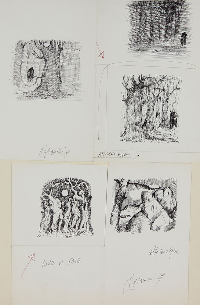 Regianini Luigi Senza titolo lotto di 5 disegni a china su carta, misure varie (cm. 50x34 c.ca complessivi) 2 disegni sono firmati e datati 1969