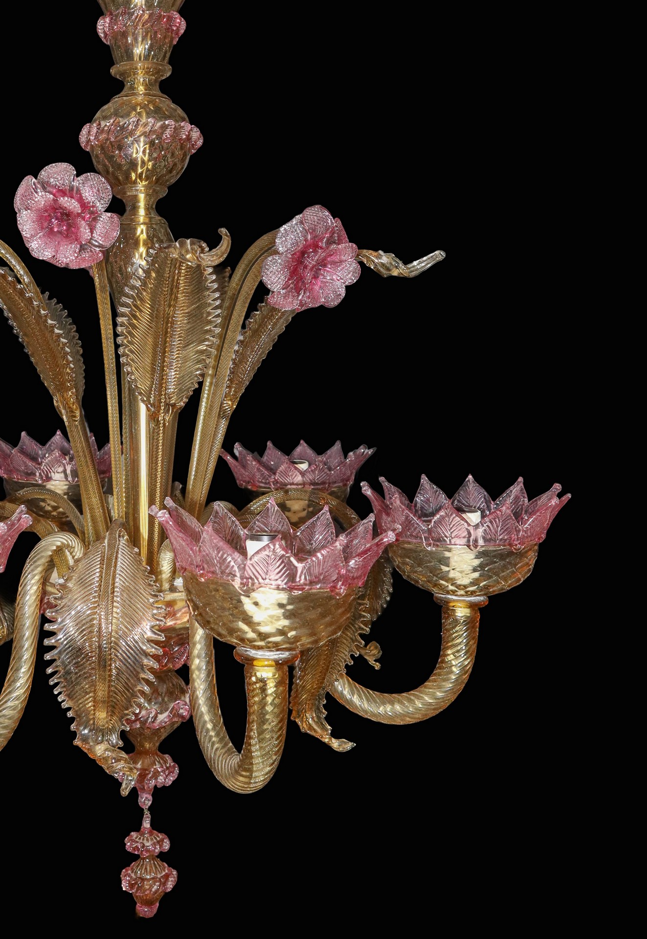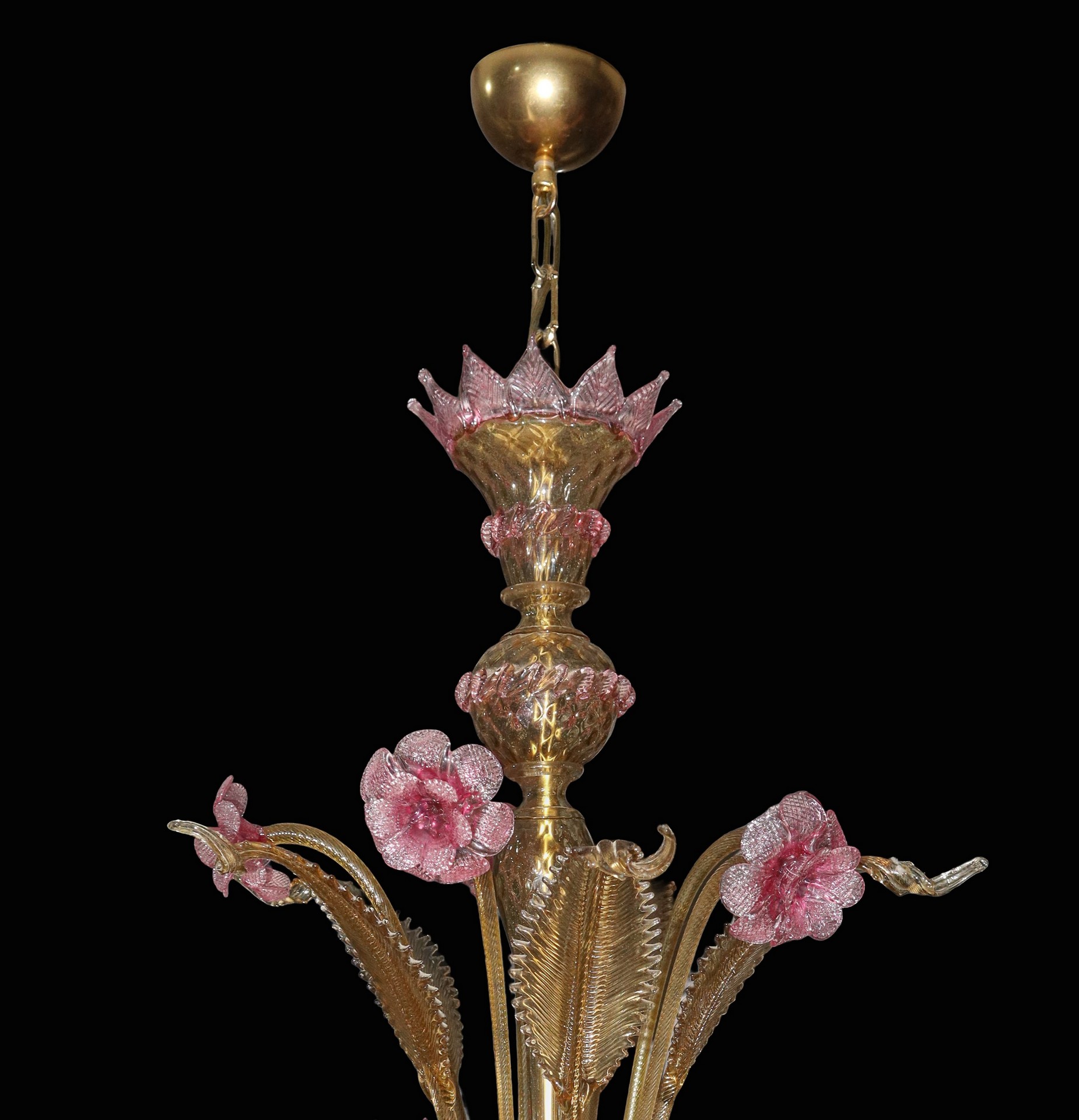 Lampadario in vetro di Murano a 6 luci giallo paglierino con fiori rosa h cm 92X74 Sbeccatura su una foglia