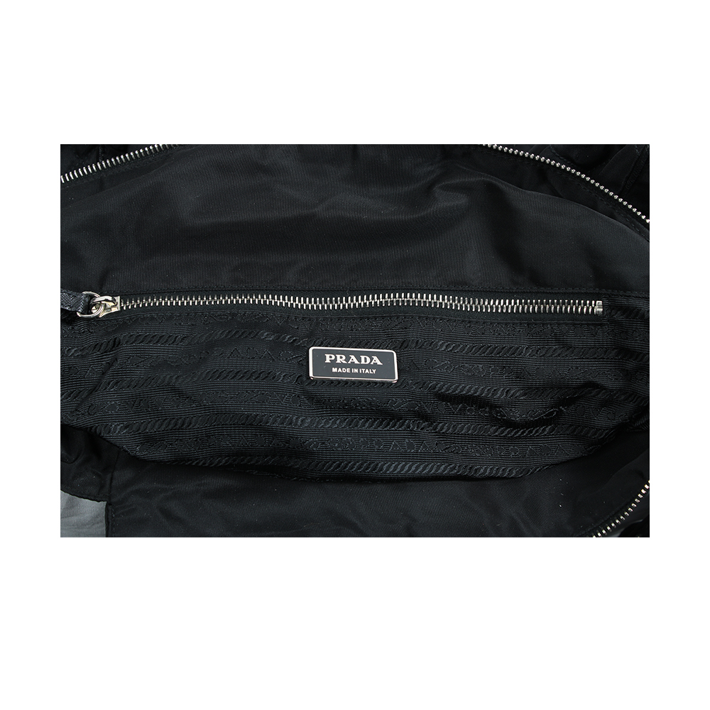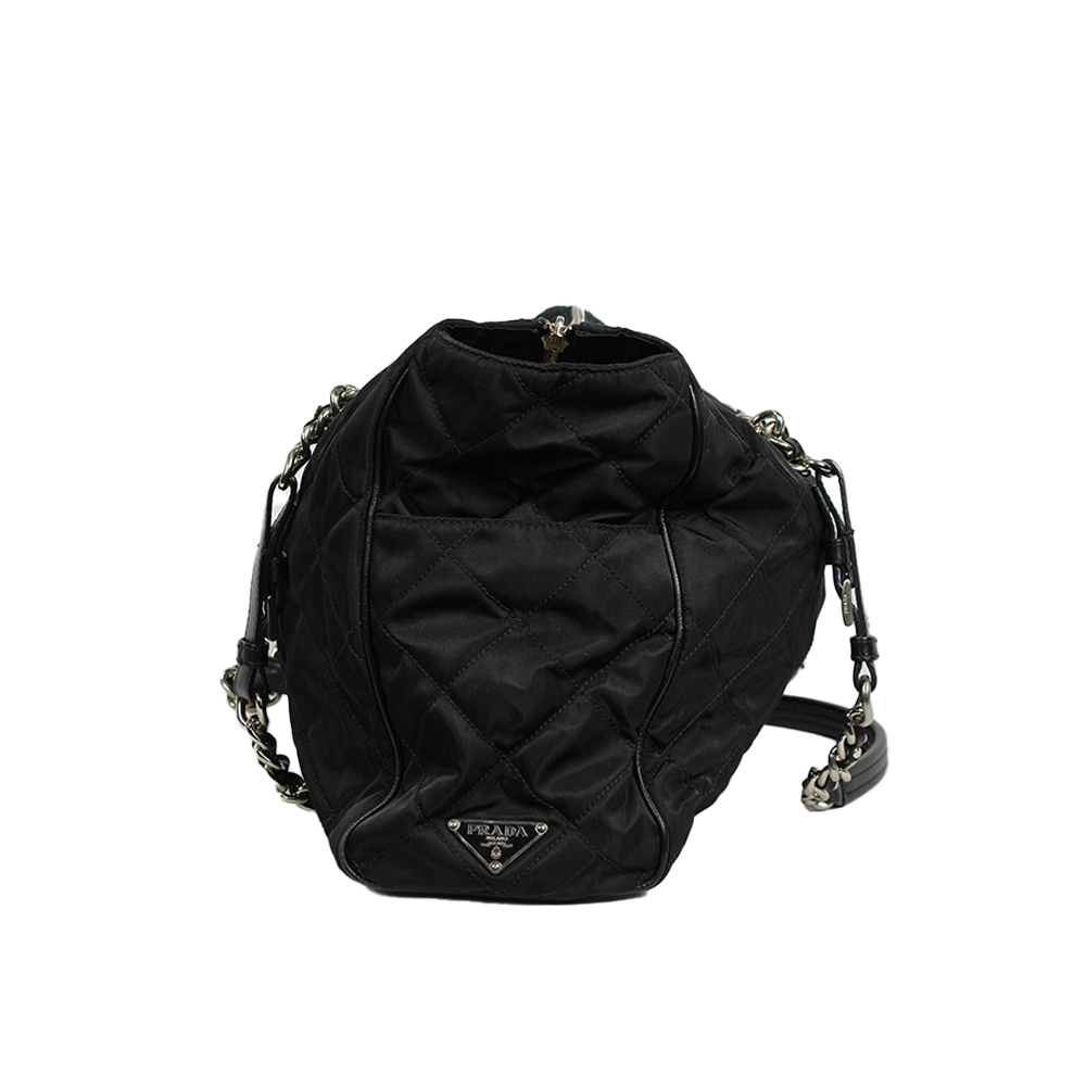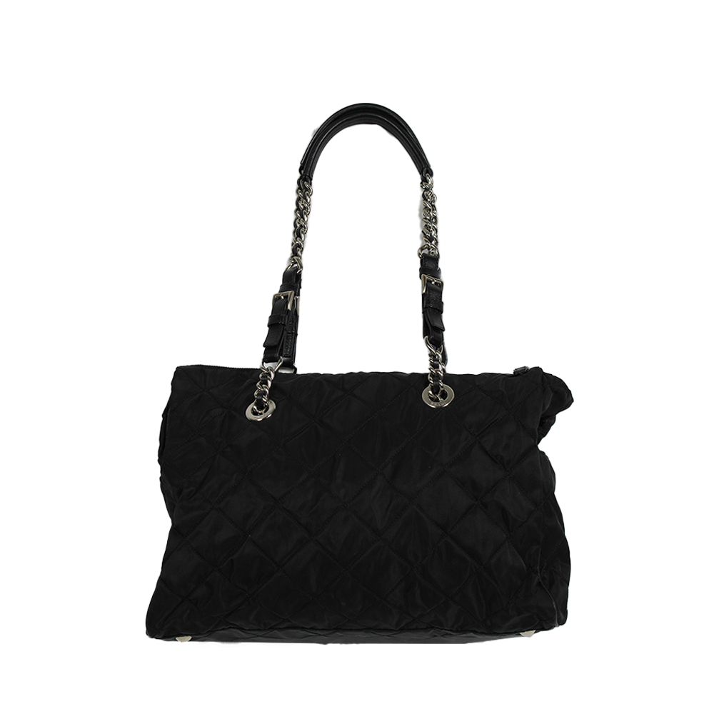 PRADA, BORSA in nylon trapuntato nero con doppi manici in pelle e catena metallica chiusura superiore con zip interno loggato con tasca e placchetta metallica Italia anni 2000-2010 h cm 29 x 35
