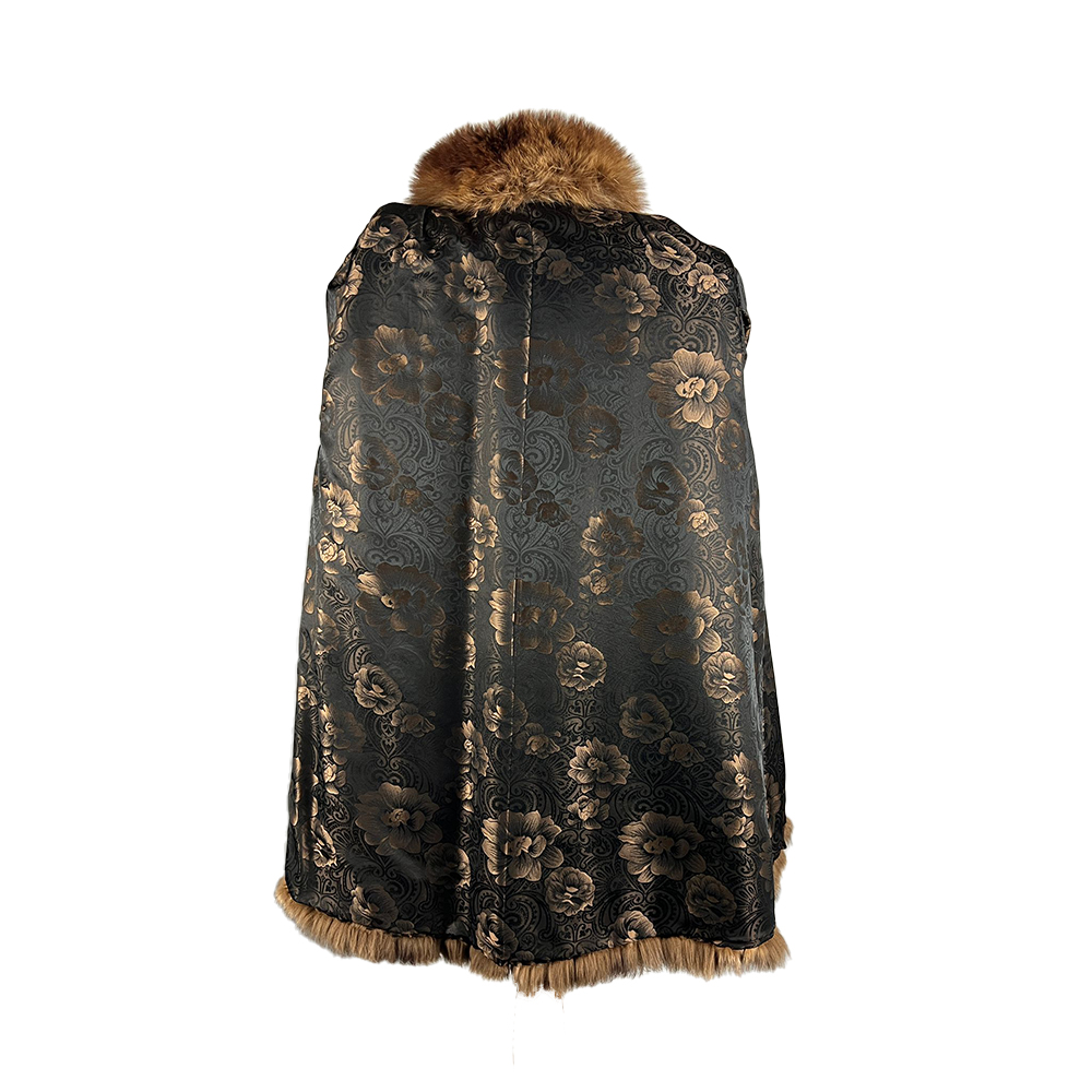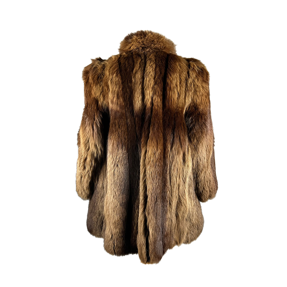 CAPPOTTO IN PELLICCIA NATURALE DI VOLPE ROSSA TAGLIA IT 46/48 con collo a scialle e fodera interna in raso marrone a decoro floreale. Italia anni 70-80