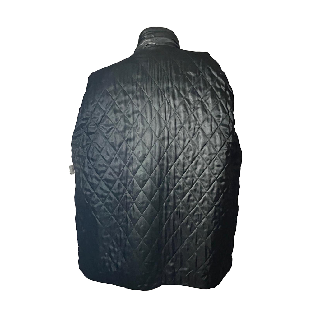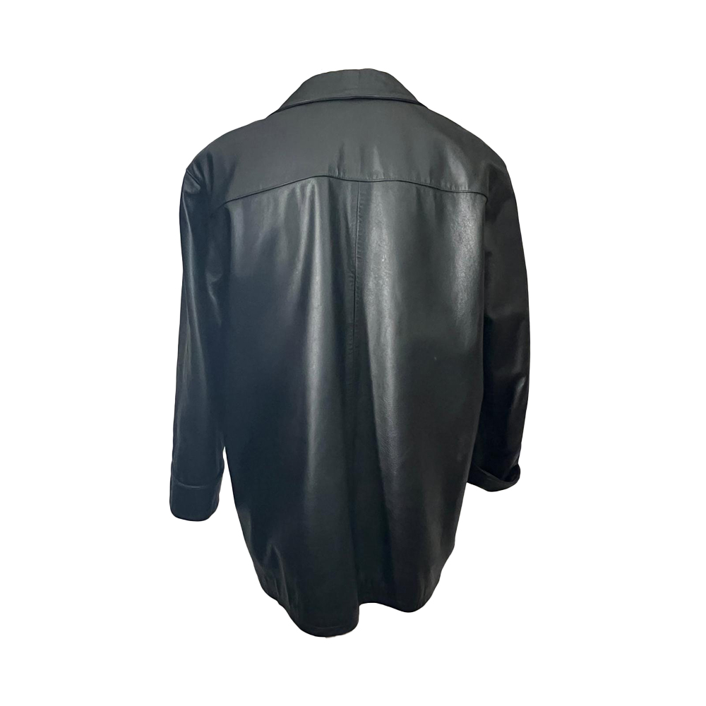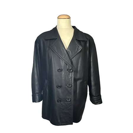 GIUBBOTTO DA UOMO in vera pelle nera taglia IT 44, modello doppio petto con ambio reverse e bottoni frontali, fodera trapuntata interna in viscosa. Italia anni 80-90.
