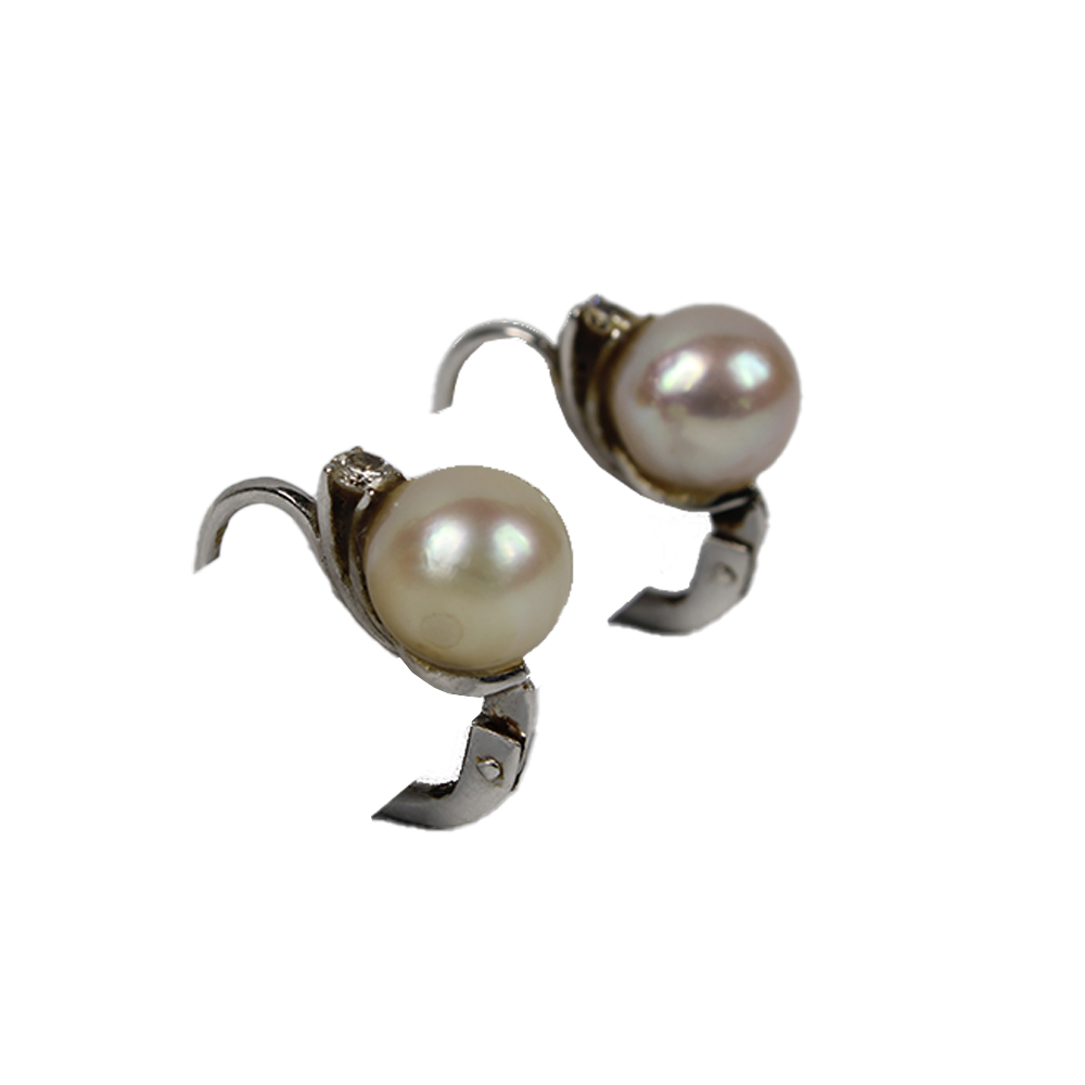 COPPIA DI ORECCHINI in oro bianco 18 kt montati con perle coltivate di forma sferica arricchite da piccolo diamante . Sicilia anni 50