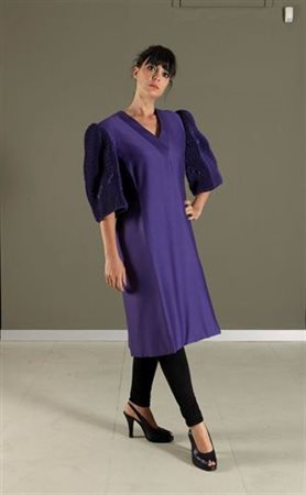 ROBERTO CAPUCCI Abito da giorno in modello unico di color lavanda intenso, scollo a V, maniche a tre quarti, con pieghettatura a piccola fisarmonica, etichetta "Alta Moda Roma", anni '60 tg. L ROBERTO CAPUCCI 1960's one of a kind, purple, V-neck dress with 3/4 puckered sleeve detail "Alta ModaRoma" label size: L