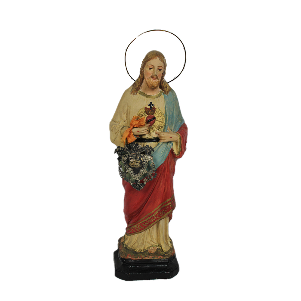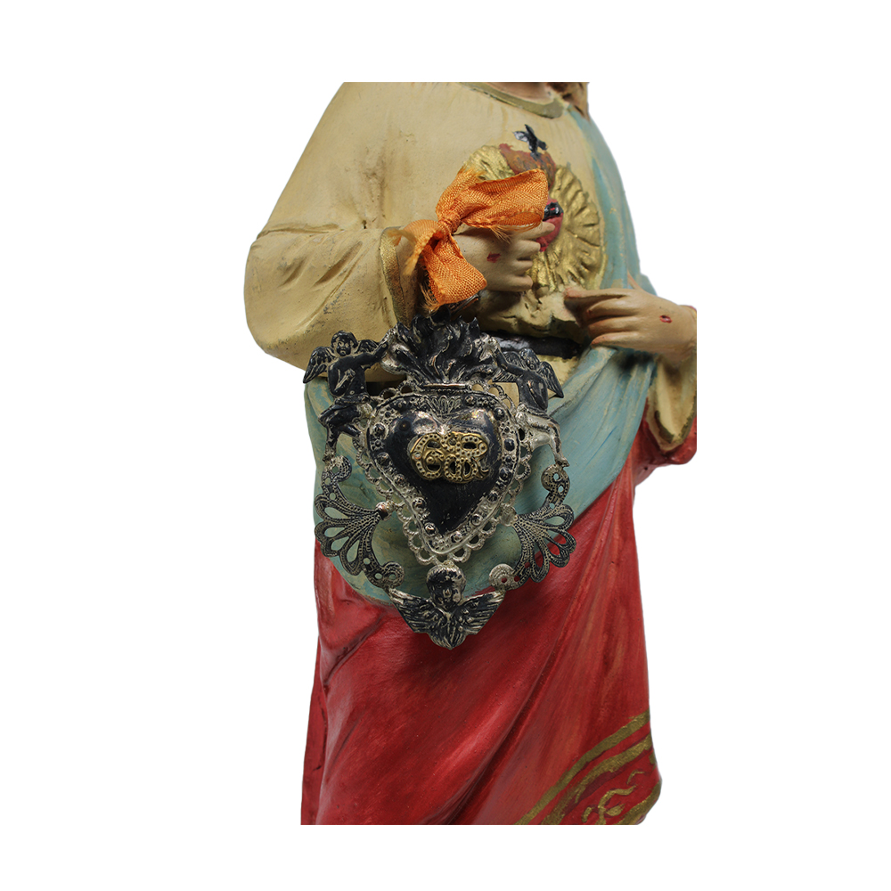 SCULTURA in terracotta policroma raffigurante Gesù con sacro cuore ed ex voto in argento maestranze siciliane primi 900 h cm 44 x 13 x 12