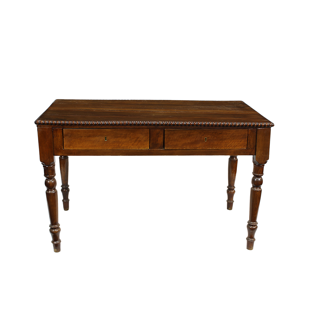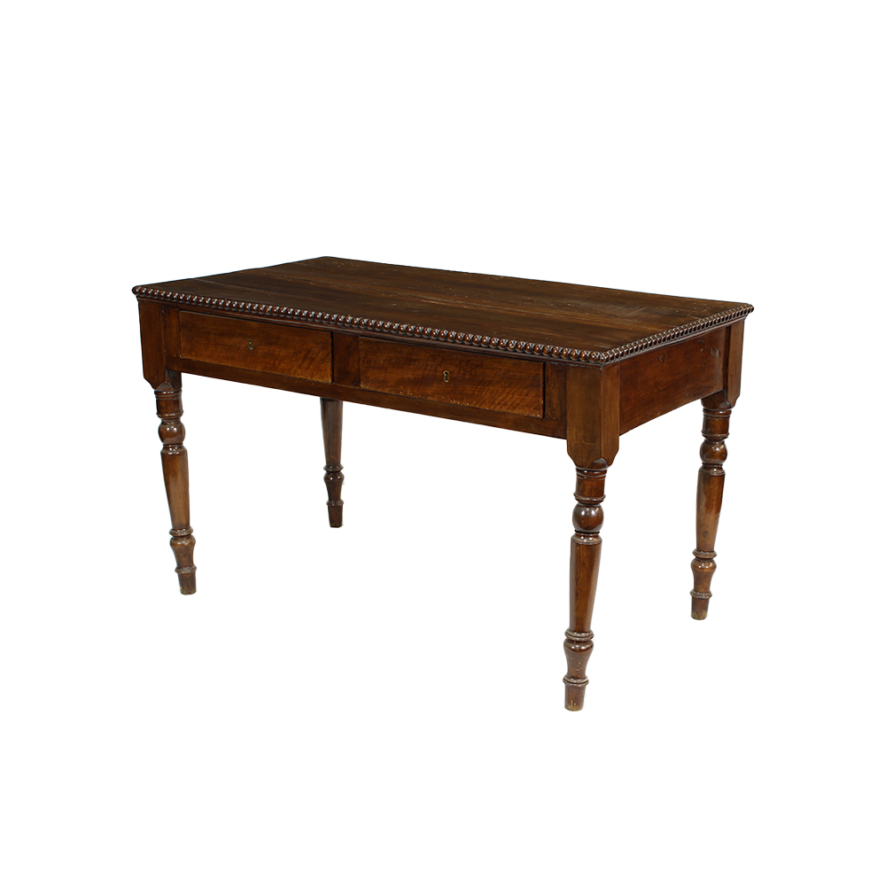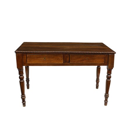SCRITTOIO in legno di noce a due cassetti gambe tornite, usura del tempo sul piano Sicilia XIX secolo h cm 82 x 133 x 76