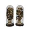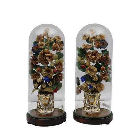 COPPIA DI VASI in porcellana con lumeggiature in oro e decorazioni floreali in diversi materiali dentro campana di vetro e base in legno Francia fine XIX secolo h cm 45 x 18