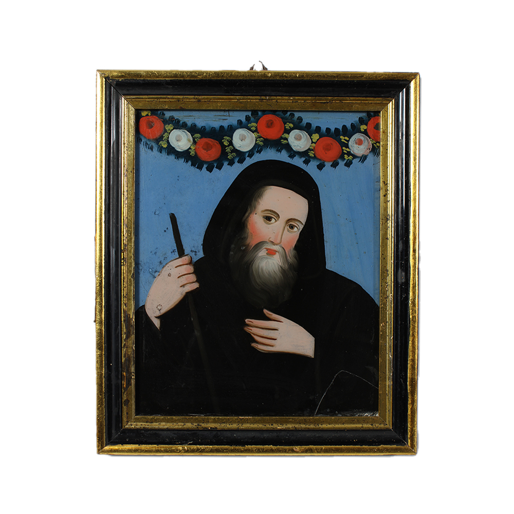 PITTURA SU VETRO raffigurante santo dentro cornice in legno dorato e laccato (lesione nell angolo inferiore destro) Sicilia XIX secolo h cm 35 x 28 - cornice h cm 44 x 37