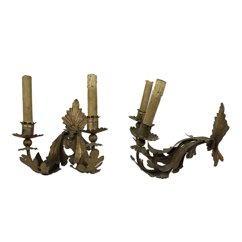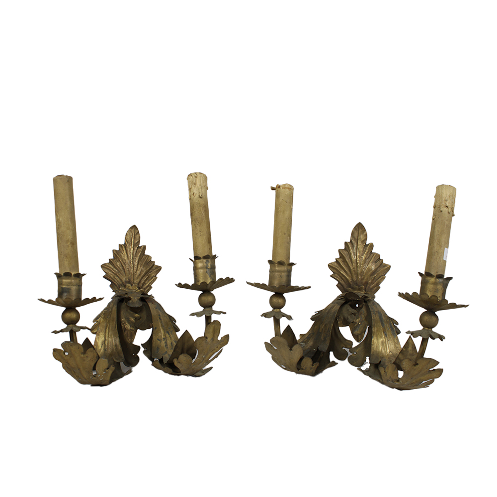 COPPIA DI APPLIQUES A DUE FIAMME in ferro battuto a motivi fogliacei Sicilia primi XIX secolo h cm 27 x 30 x 23
