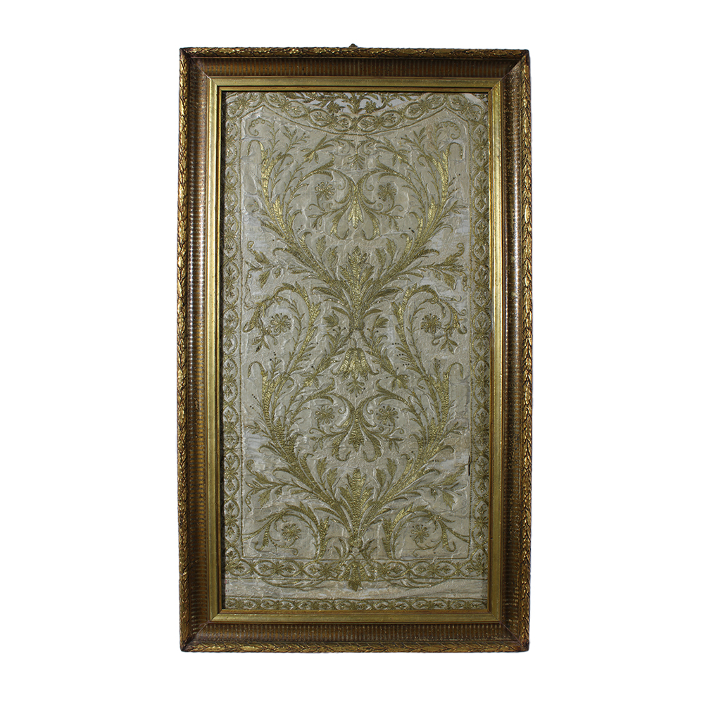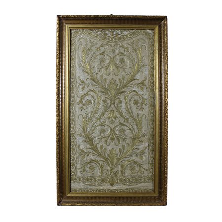 TESSUTO in seta ricamato a fili d'oro dentro cornice non coeva in legno dorato maestranze siciliane XVIII secolo h cm 105 x 60