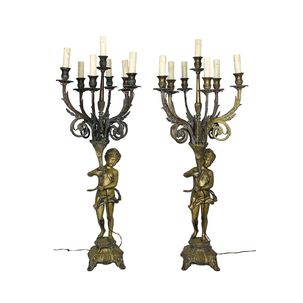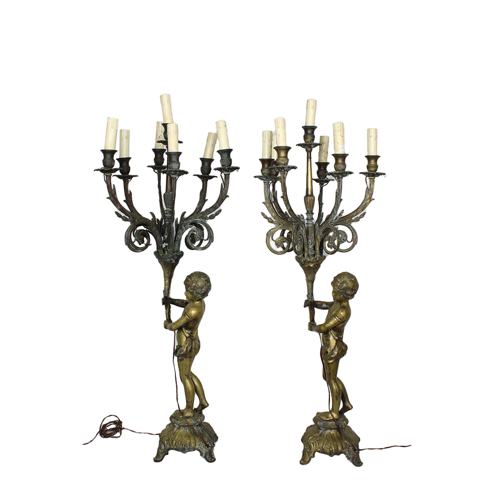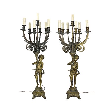 COPPIA DI GRANDI CANDELABRI in bronzo dorato raffigurante putti che sorreggono ceppo a sette fiamme elettrificate maestranze siciliane XIX/XX secolo h cm 90 x 35 x 35