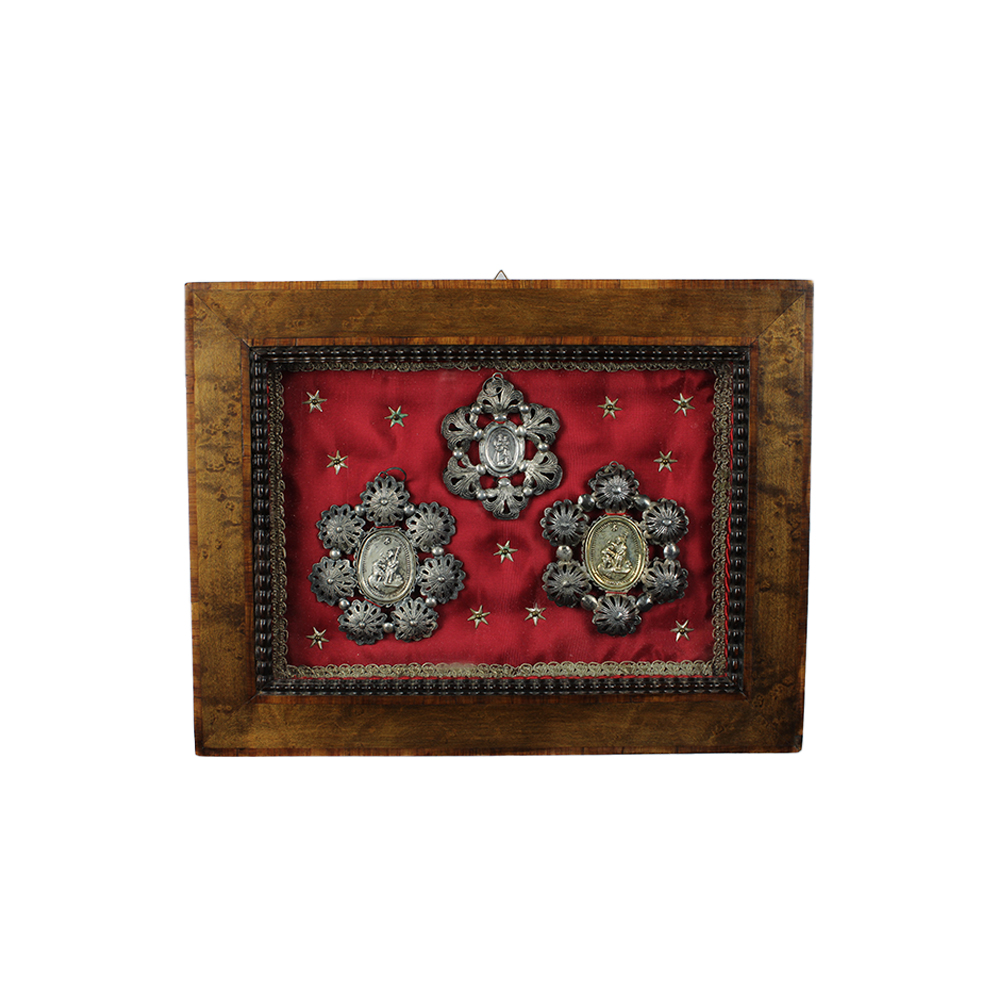 LOTTO COMPOSTO DA 3 pendenti in argento raffigurante scene sacre dentro cornice in legno Sicilia primi 900 h cm 23 x 30