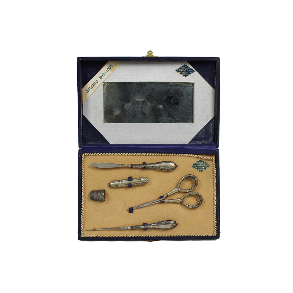 SET DA CUCITO in argento 800 dentro custodia maestranze siciliane primi 900 cofanetto cm 14 x 21