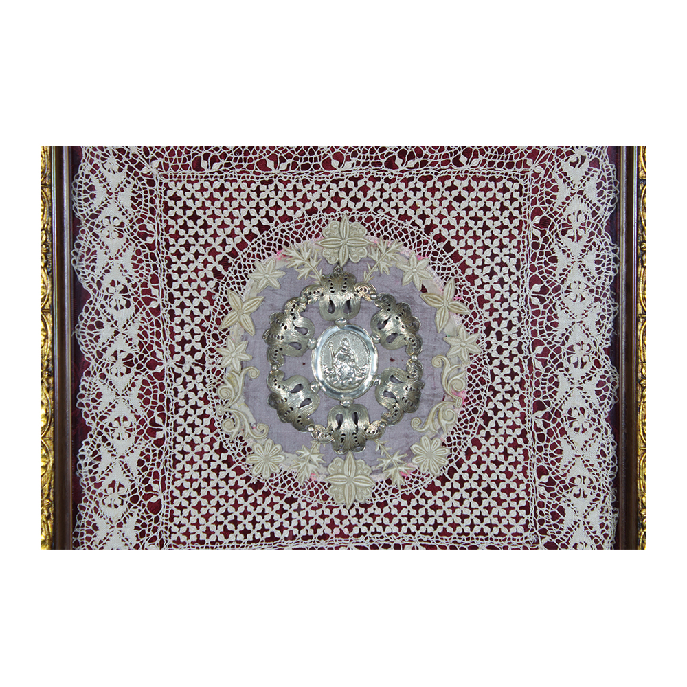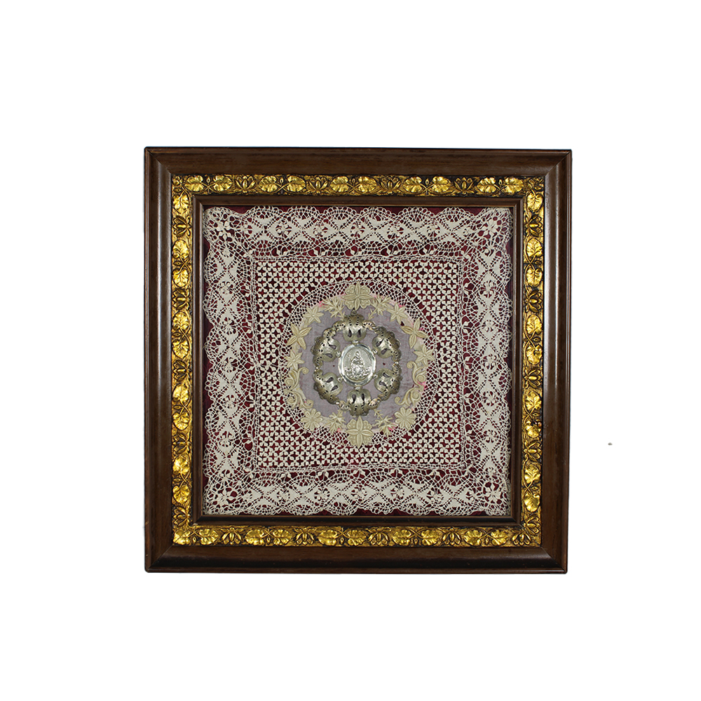 PLACCA DECORATIVA in argento raffigurante Santo montato su merletto dentro cornice in legno con lumeggiature in oro Sicilia primi 900 h cm 38 x 38