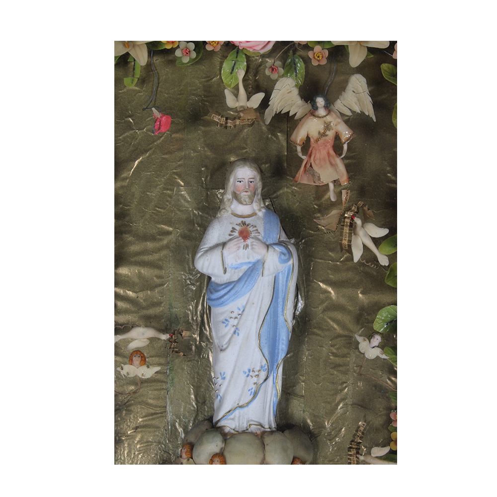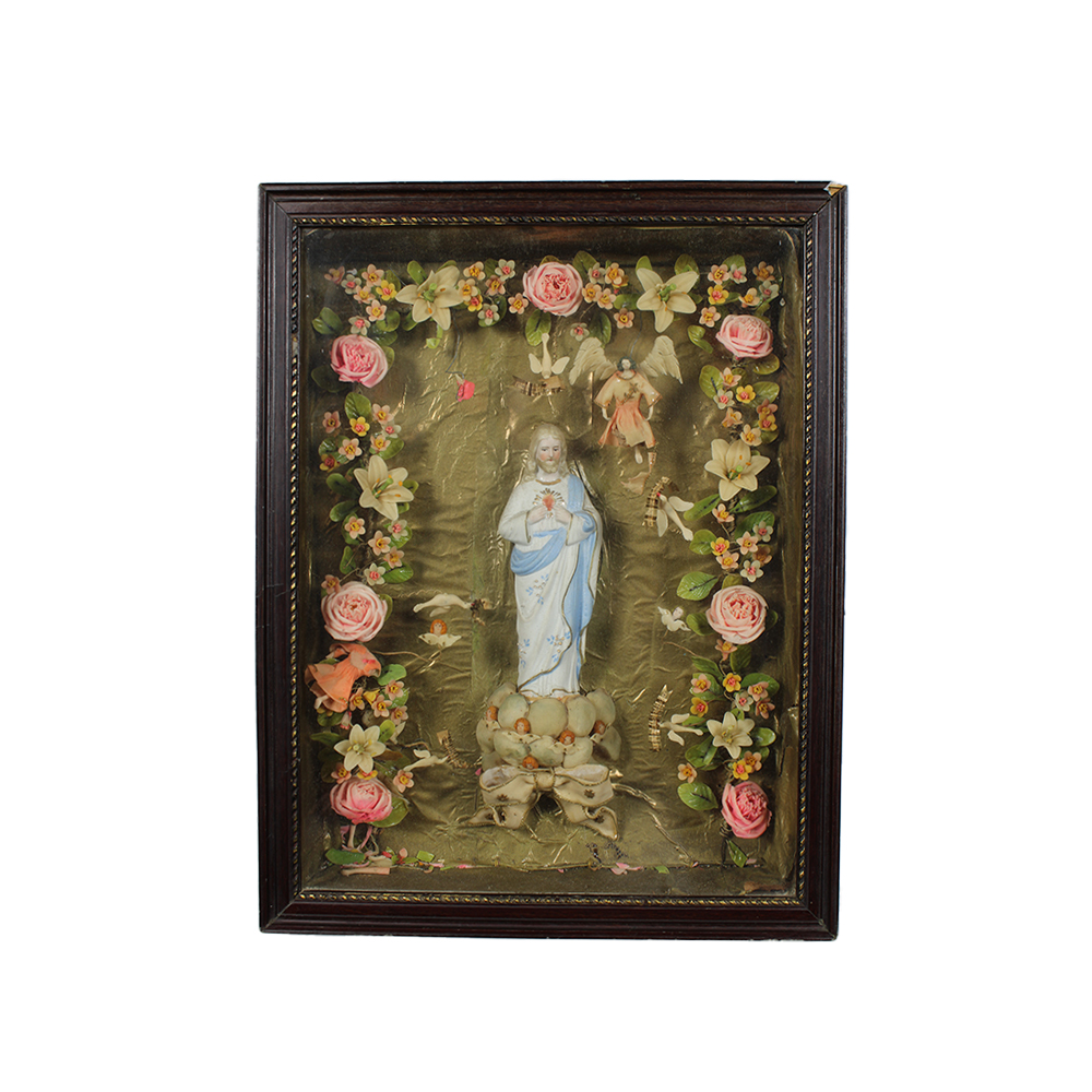 TECA contenente scultura in biscuit raffigurante cena sacra cuore di Gesù arricchita da decorazioni floreali in cera e altri materiali Sicilia XIX/XX secolo h cm 46 x 36 x 8,5