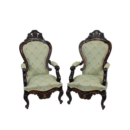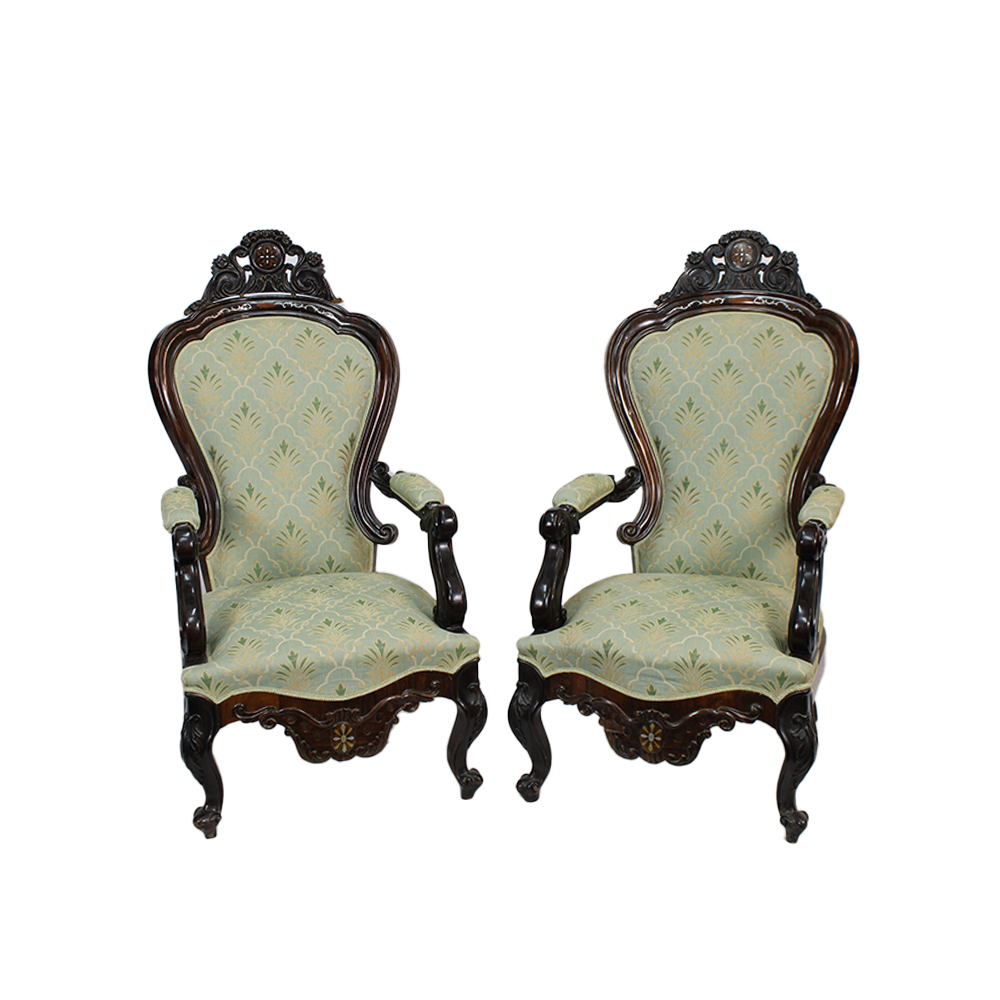 COPPIA DI POLTRONE CARLO X in legno di palissandro con tarsie in legno rosa e metallo seduta e spalliera imbottita Sicilia XIX secolo h cm 115 x 63 x 67