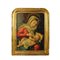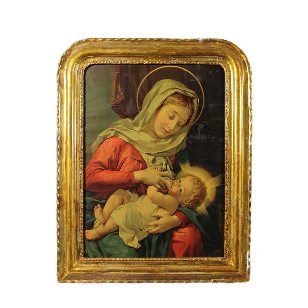 CORNICE in legno dorato in argento e mecca contenente stampa colorata raffigurante Madonna con Bambino Sicilia XIX secolo h cm 86 x 67