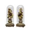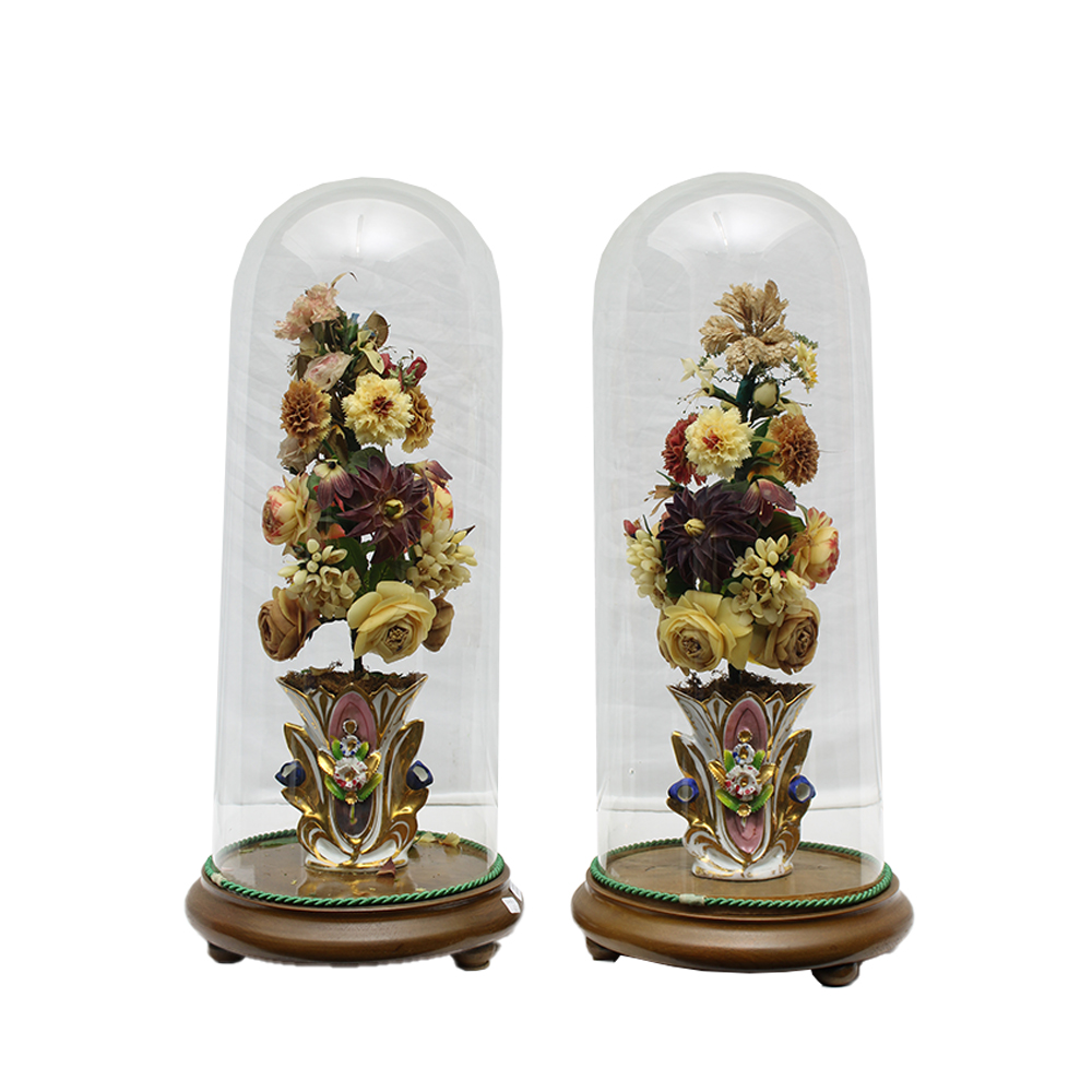 COPPIA DI VASI LUIGI FILIPPO in porcellana dipinta in policromia e lumeggiature in oro arricchita da composizione in cera e altri materiali dentro campana in vetro Francia XIX secolo h cm 62 x 27