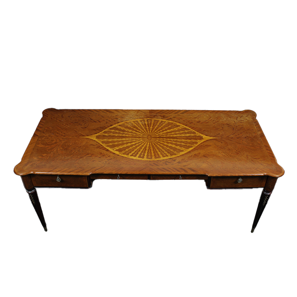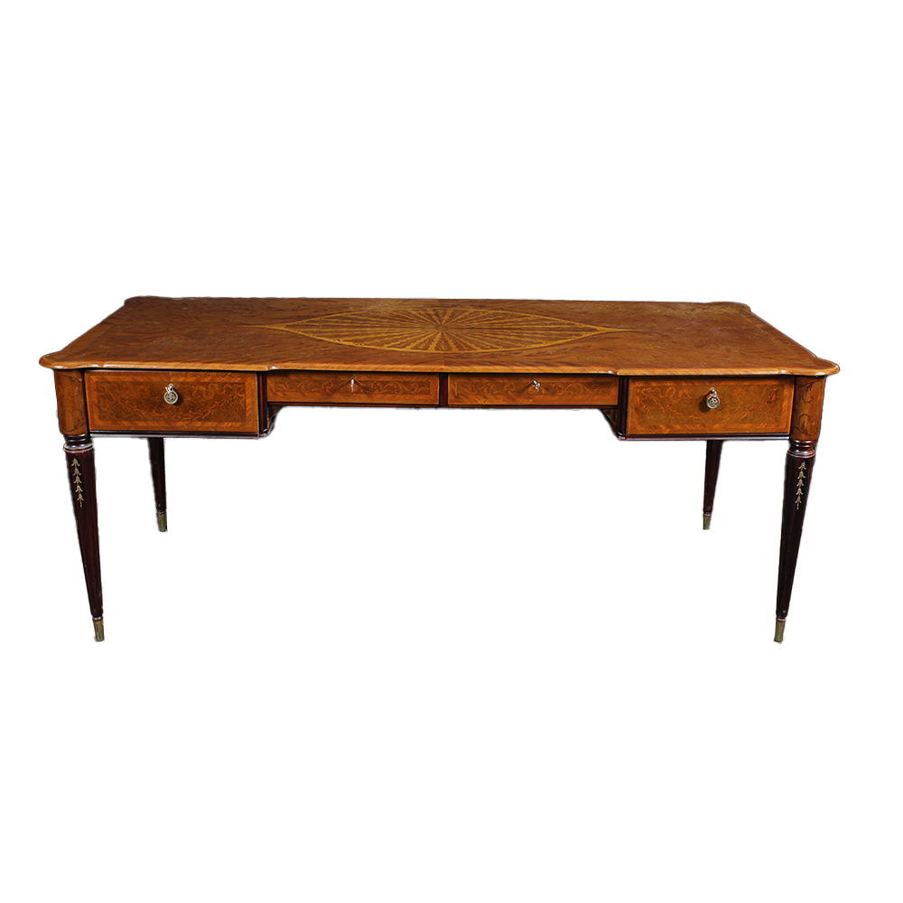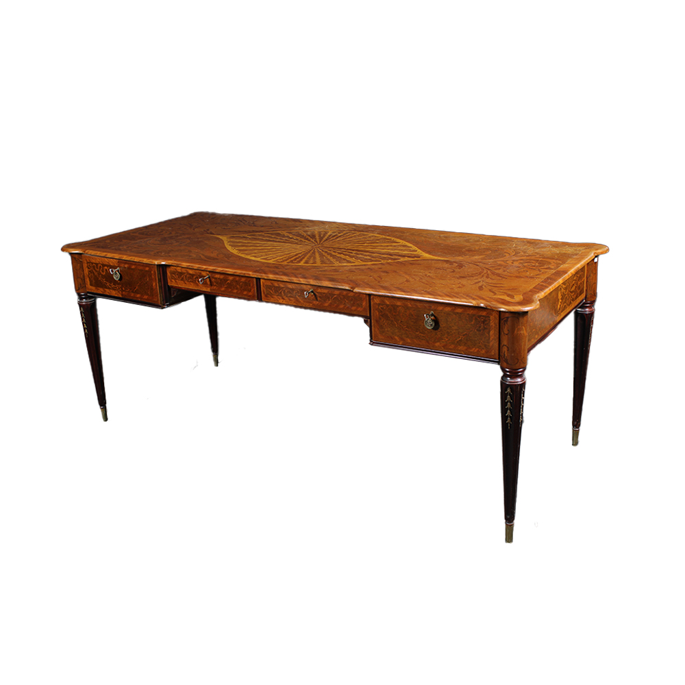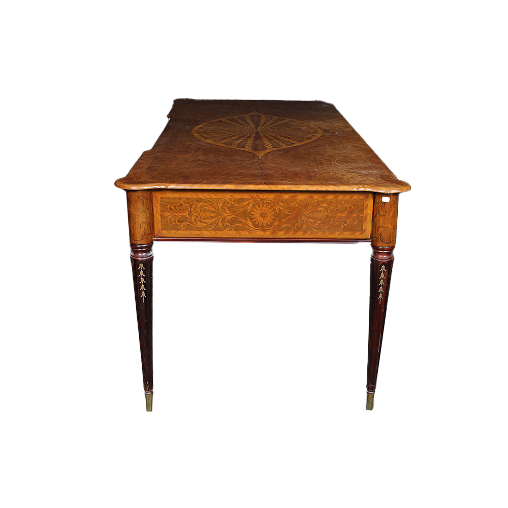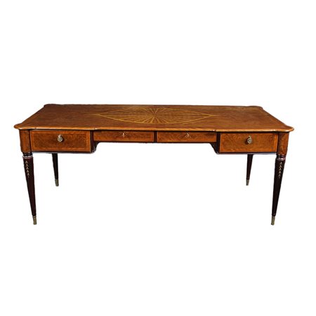SCRIVANIA in palissandro con tarsie in varie essenze di legno piedi a tromba arricchiti da applicazioni dorate Francia XIX/XX secolo h cm 80 x 201 x 90