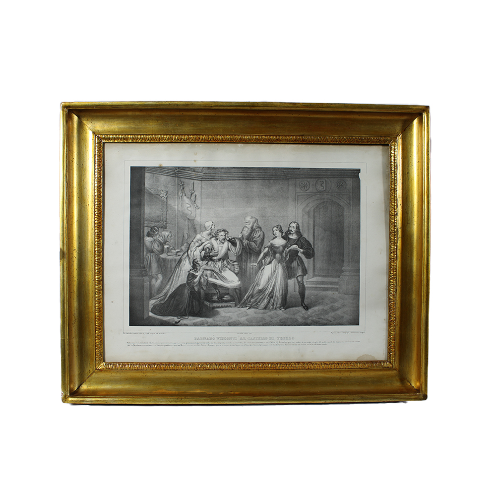 CORNICE A CANNA CIACCATA in legno dorato ad argento e mecca contenente stampa raffigurante Banabò Visconti al Castello di Trezzo Sicilia XIX secolo h cm 69 x 84,5