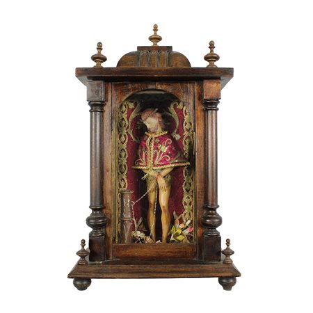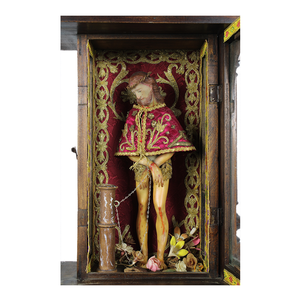 GRUPPO SCULTOREO in ceroplastica con Gesù Cristo alla colonna dentro teca in legno di noce maestranze siciliane XIX secolo h cm 53 x 31 x 16