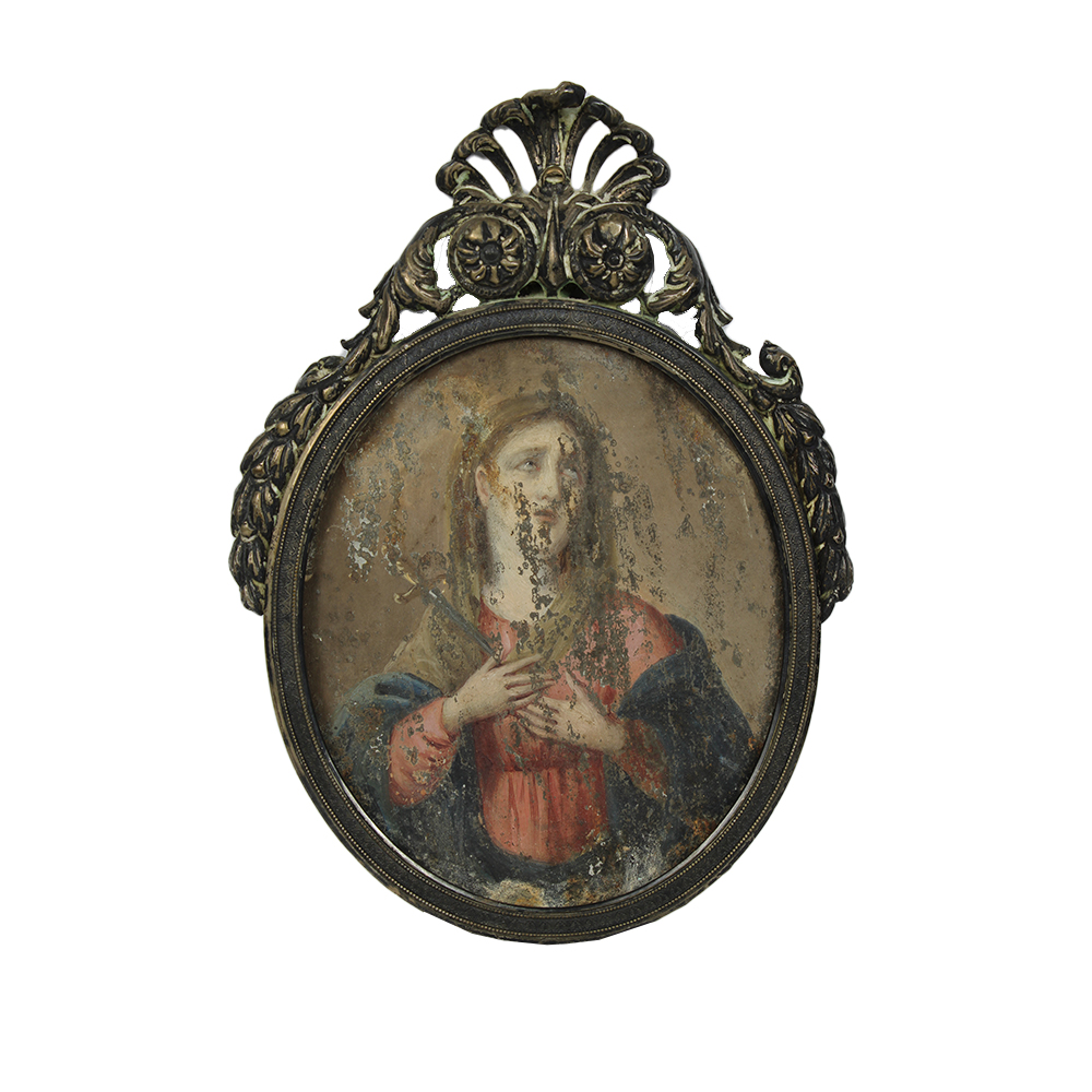 OLIO SU RAME raffigurante Madonna Addolorata dentro cornice in argento , usure del tempo maestranze siciliane XVIII secolo h cm 19,5 x 14