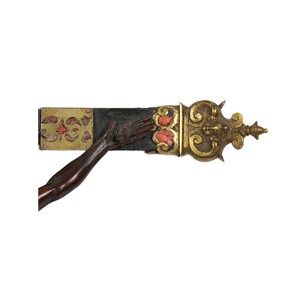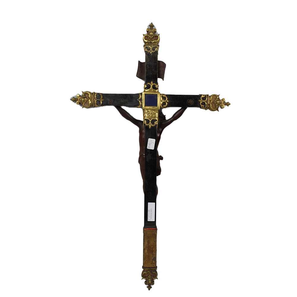 IMPORTANTE CROCIFISSO DEVOZIONALE in bosso finemente scolpito a tutto tondo con croce in legno ebanizzato con copri croce in fusione di bronzo, finemente cesellato e dorato a cartigli con cherubini arricchito da applicazioni in rame dorato e traforato con corallo trapanese a retro incasso. Sul retro piccolo quadrante in lapislazzuli. Arte Barocca Siciliana XVIII/XIX secolo, vecchi restauri alle mani, e piccoli interventi generali h cm 56 x 31