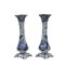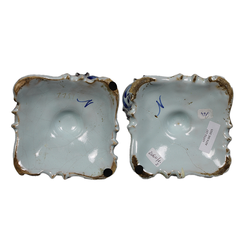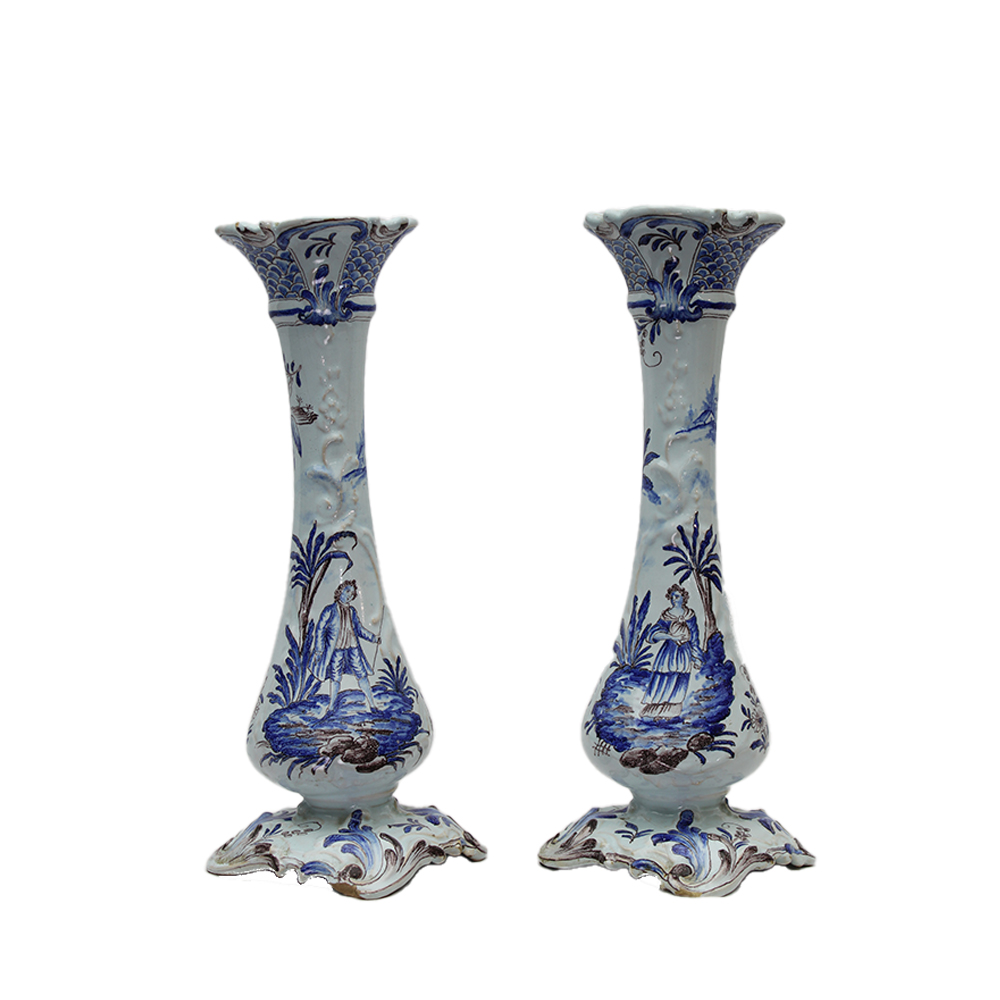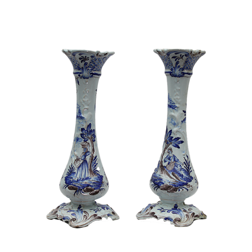 COPPIA DI VASI A TROMBA in maiolica dipinta in monocromia nel tono del blu su fondo bianco raffigurante paesaggi manifattura Faenza monogrammata col marchio N XIX secolo h cm 35 x 16 x 16