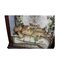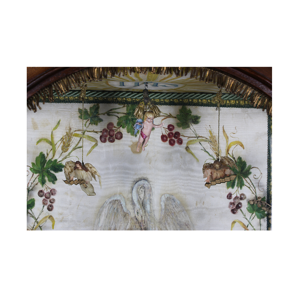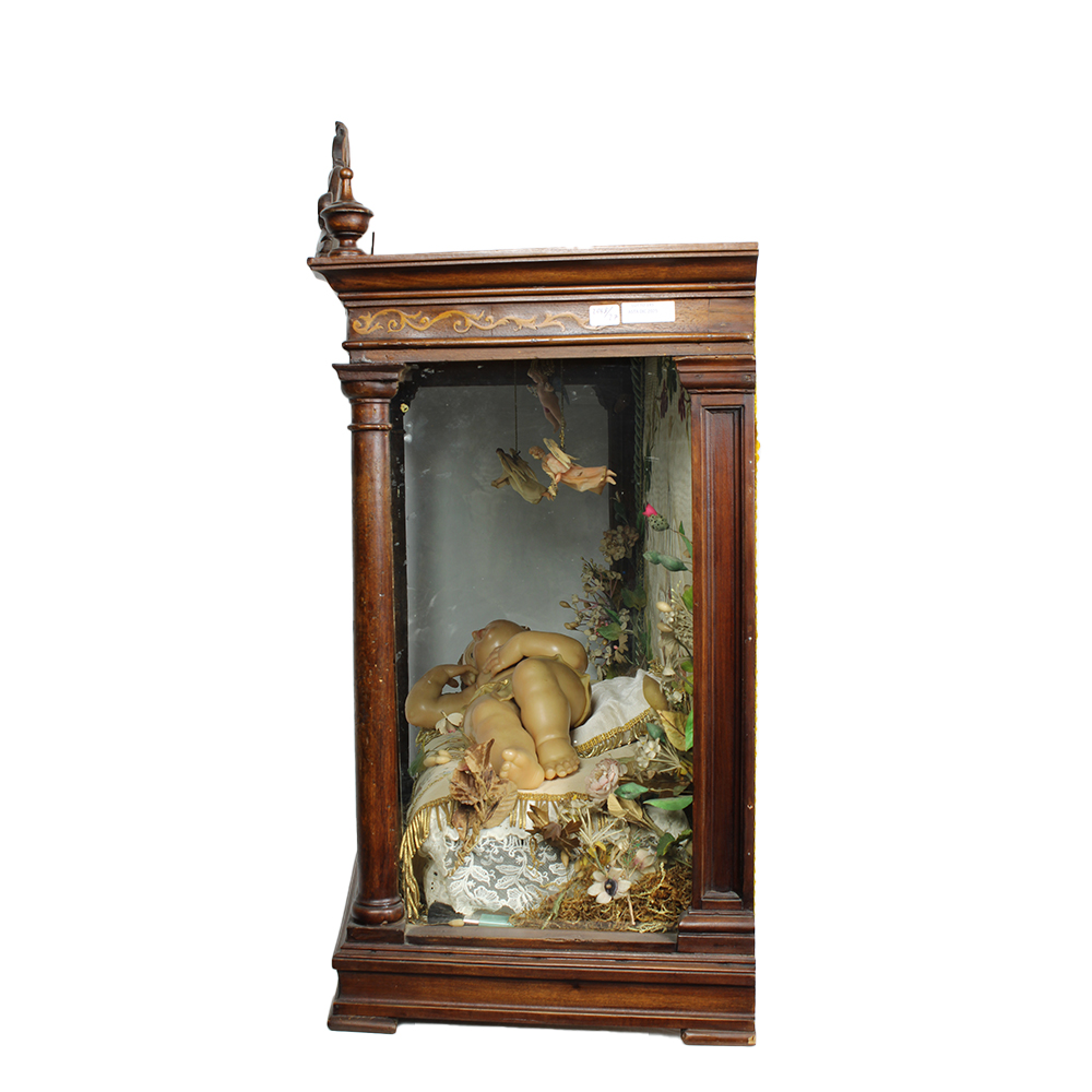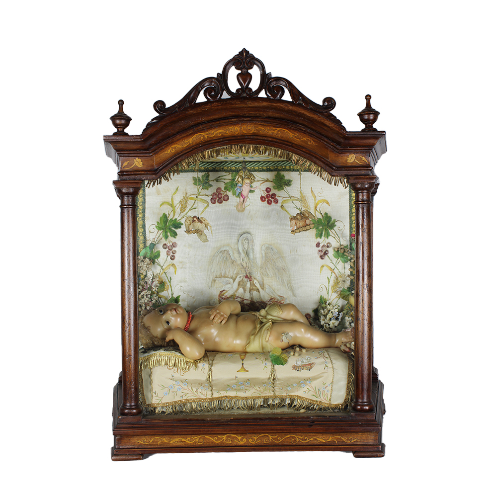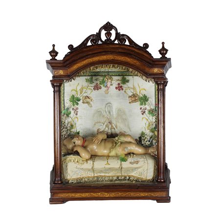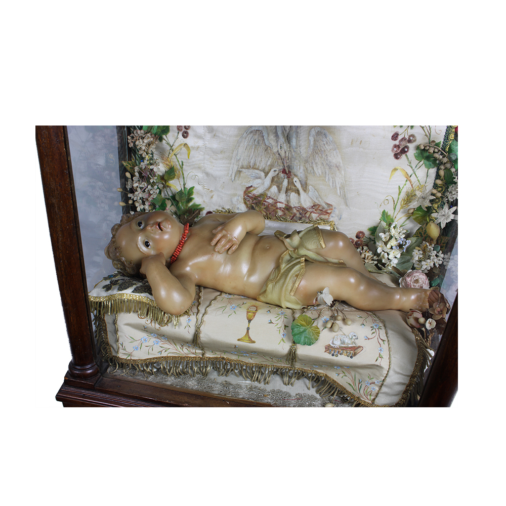 GESÙ BAMBINO in ceroplastica dipinto con lumeggiature in oro e collana in corallo su letto realizzato da antichi tessuti in seta ricamata dentro teca in legno di noce con tarsie in bosso arricchito da decorazioni floreali e angeli maestranze siciliane primi XIX secolo h cm 74 x 57 x 32