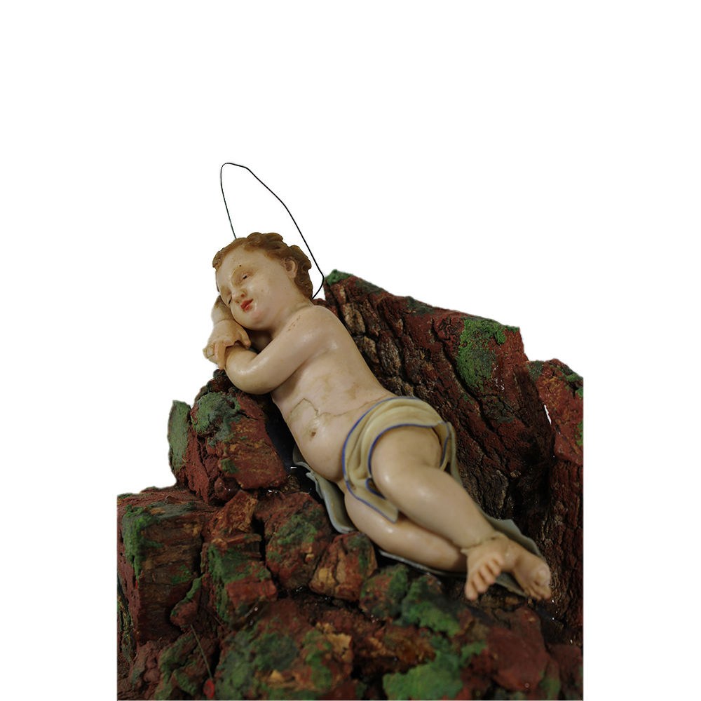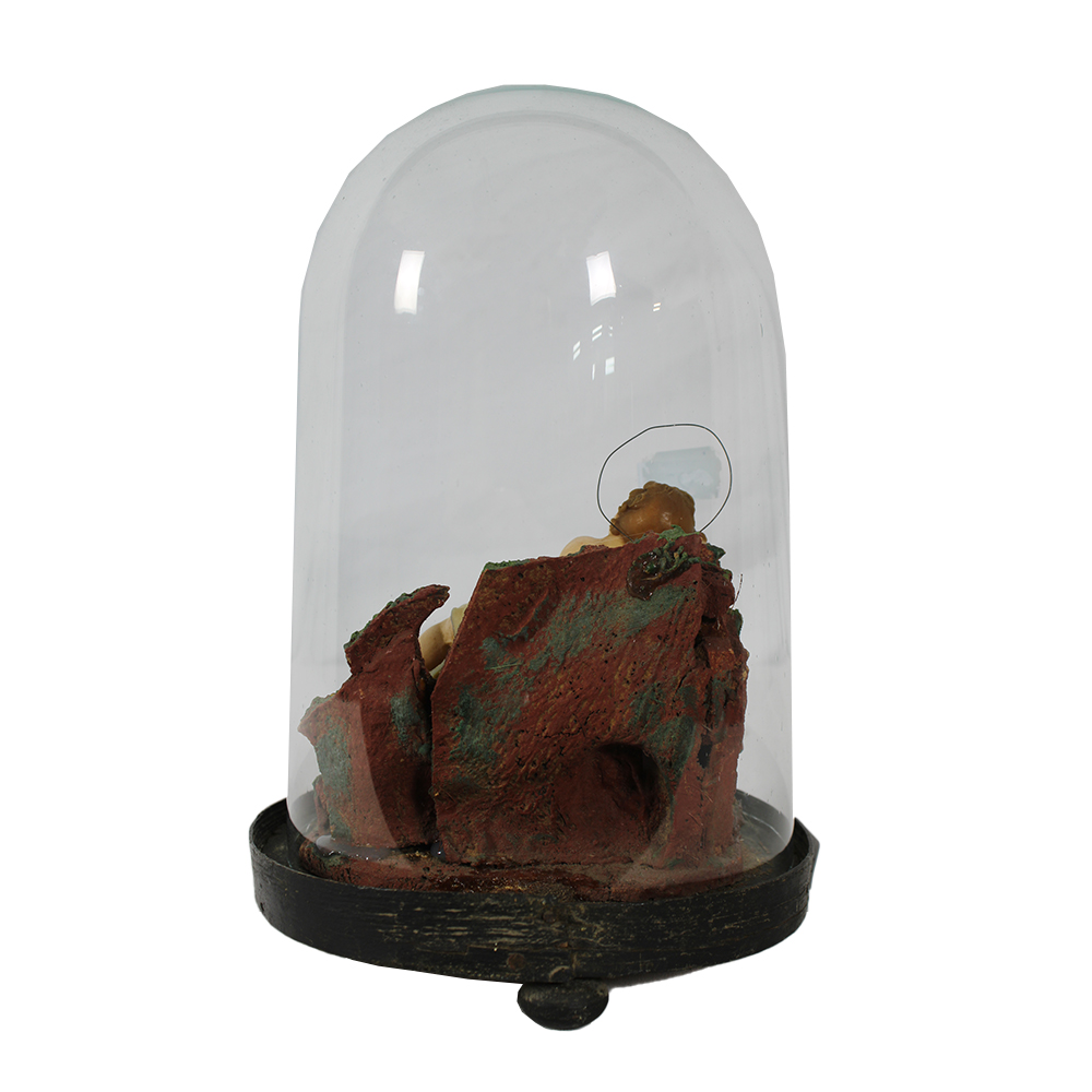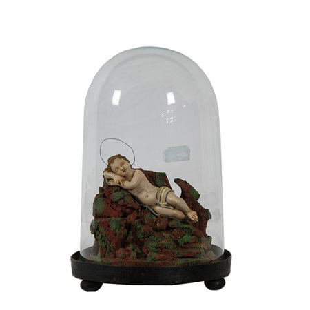 SCULTURA in ceroplastica raffigurante bambinello dentro campana in vetro con base in legno, usure del tempo e vari restauri maestranze siciliane XIX secolo h cm 30 x A 18