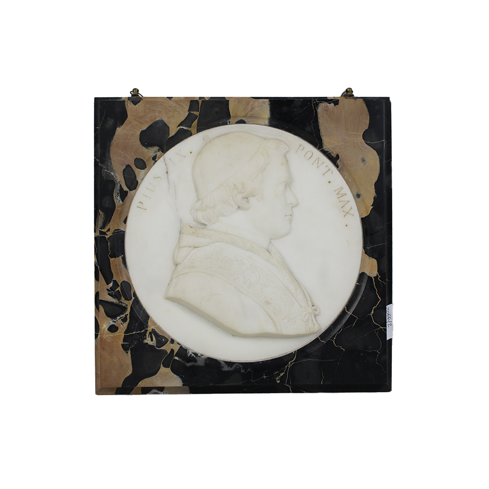 PLACCA scolpita a basso rilievo in marmo bianco di Carrara raffigurante Pio IX con cornice in marmo portoro Sicilia primi 900 h cm 24 x 24